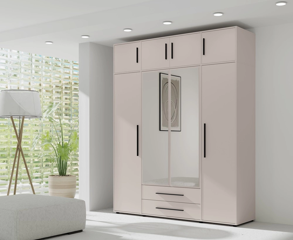 Die Erweiterung des Kleiderschranks garantiert komfortable und problemlose Nutzung und Langlebigkeit des gesamten Möbelstücks für viele Jahre der Nutzung. Die beige Farbe in einem Kaschmir-Ton verleiht dem Raum eine helle und gemütliche Atmosphäre. Die Schrankerweiterung eignet sich als verspiegelte Schrankerweiterung für das Schlafzimmer, eine Schrankerweiterung für den Flur oder eine Schrankerweiterung für das Kinderzimmer. Er eignet sich auch perfekt als Erweiterung des Kleiderschranks im Flur.
