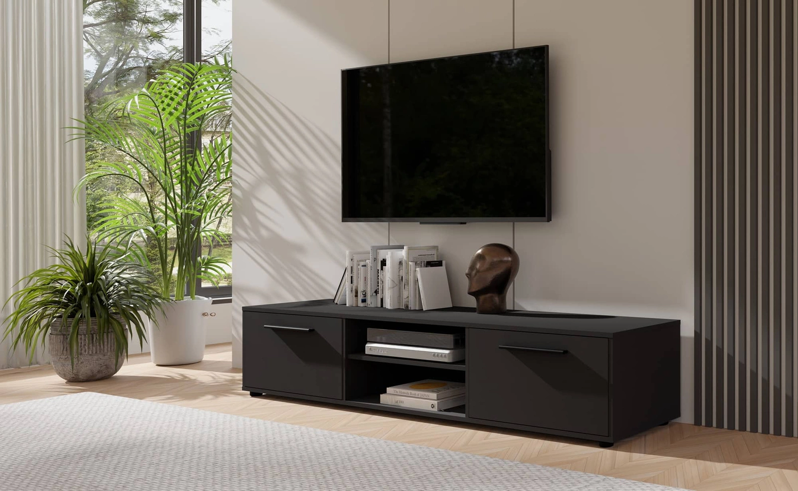 Der RTV-Schrank Maxione 190 cm in Schwarz ist die perfekte Ergänzung für jedes Wohnzimmer oder Sitzungszimmer.