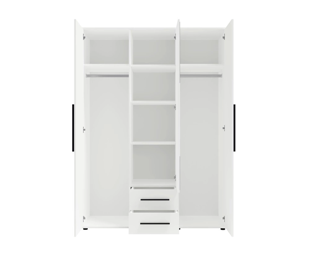 Der Osma Kleiderschrank ist unterteilt in zwei teile mit Stange zum Aufhängen von Kleidung i teil mit Regalen. Geräumige Schubladen zusätzlichen Stauraum bieten. Garderobe ist hergestellt aus hochwertiger laminierter Karton 16 mm dick, die resistent gegen äußere Einflüsse wie Druckstellen, Stöße und unglückliche Kratzer ist. Die mittlere Tür des Kleiderschranks ist mit einem großen Spiegel versehen spiegel, aufhellung und optische Vergrößerung des Raumes. Die stilvollen Abschlüsse der Fronten sind schlichtes Schwarz griffe, die zusätzlich zu ihrer Hauptfunktion ein äußerst geschmackvolles Erscheinungsbild bieten. Die Garderobe ist äußerst benutzerfreundlich gestaltet und bietet viel Stauraum.