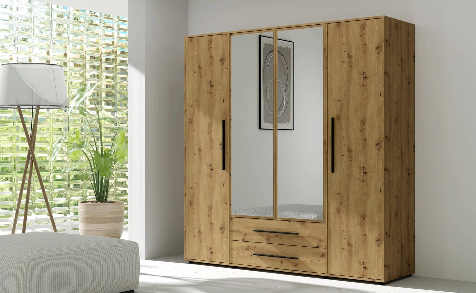 Der Osma Kleiderschrank ist unterteilt in zwei teile mit Stange zum Aufhängen von Kleidung i teil mit Regalen. Geräumige Schubladen zusätzlichen Stauraum bieten. Garderobe ist hergestellt aus hochwertiger laminierter Karton 16 mm dick, die resistent gegen äußere Einflüsse wie Druckstellen, Stöße und unglückliche Kratzer ist. Die mittlere Tür des Kleiderschranks ist mit einem großen Spiegel versehen spiegel, aufhellung und optische Vergrößerung des Raumes. Die stilvollen Abschlüsse der Fronten sind schlichtes Schwarz griffe, die zusätzlich zu ihrer Hauptfunktion ein äußerst geschmackvolles Erscheinungsbild bieten. Die Garderobe ist äußerst benutzerfreundlich gestaltet und bietet viel Stauraum.