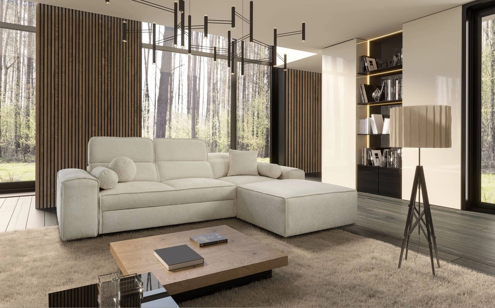 Ecksofa mit Schlaffunktion Viano creme rechts stilvolles Ecksofa mit interessanter Form verstellbare Kopfstützen Zierkissen
