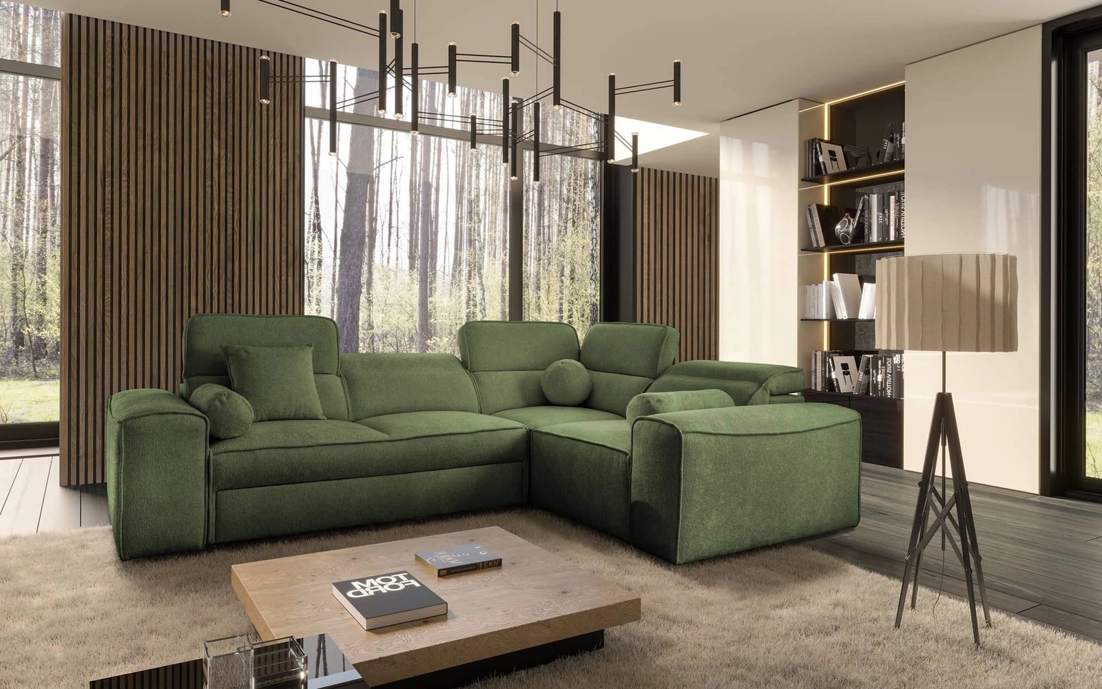 Ecksofa mit Schlaffunktion Viano II grünes rechtsseitig Designer aufklappbares Ecksofa, das sich perfekt in moderne Einrichtungen einfügt