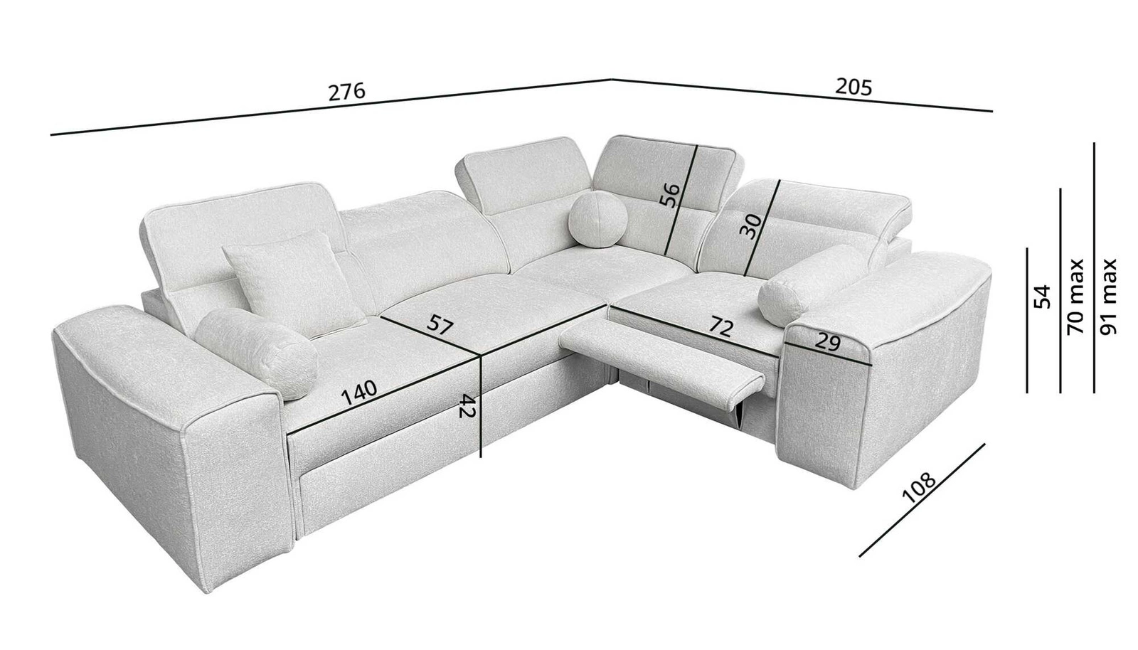 Die Abmessungen der Möbel ermöglichen raumplanung in einem kleineren Wohn- oder Aufenthaltsraum. Breite der Ecke 276 cm, höhe 91 cm und Tiefe 205 cm. Die Liegefläche des Eckschrankes beträgt 127x198 cm. Die Sitzhöhe des Möbels beträgt 42 cm und die Höhe der Rückenlehne beträgt 56 cm. Gewellte Federn und T30-Polyurethanschaum ist das Material, aus dem der Sitz der Ecke hergestellt ist. Feste Rückenlehne mit verstellbaren Kopfstützen ermöglicht eine einfache anpassung sie können die Neigung der Kopfstützen nach Ihren Wünschen einstellen und so für eine bequeme Erholung nach einem langen Tag sorgen, die Sie, Ihre Lieben und auch Ihre Gäste, die auf diesem einzigartigen Ecksofa Platz nehmen, zu schätzen wissen werden.