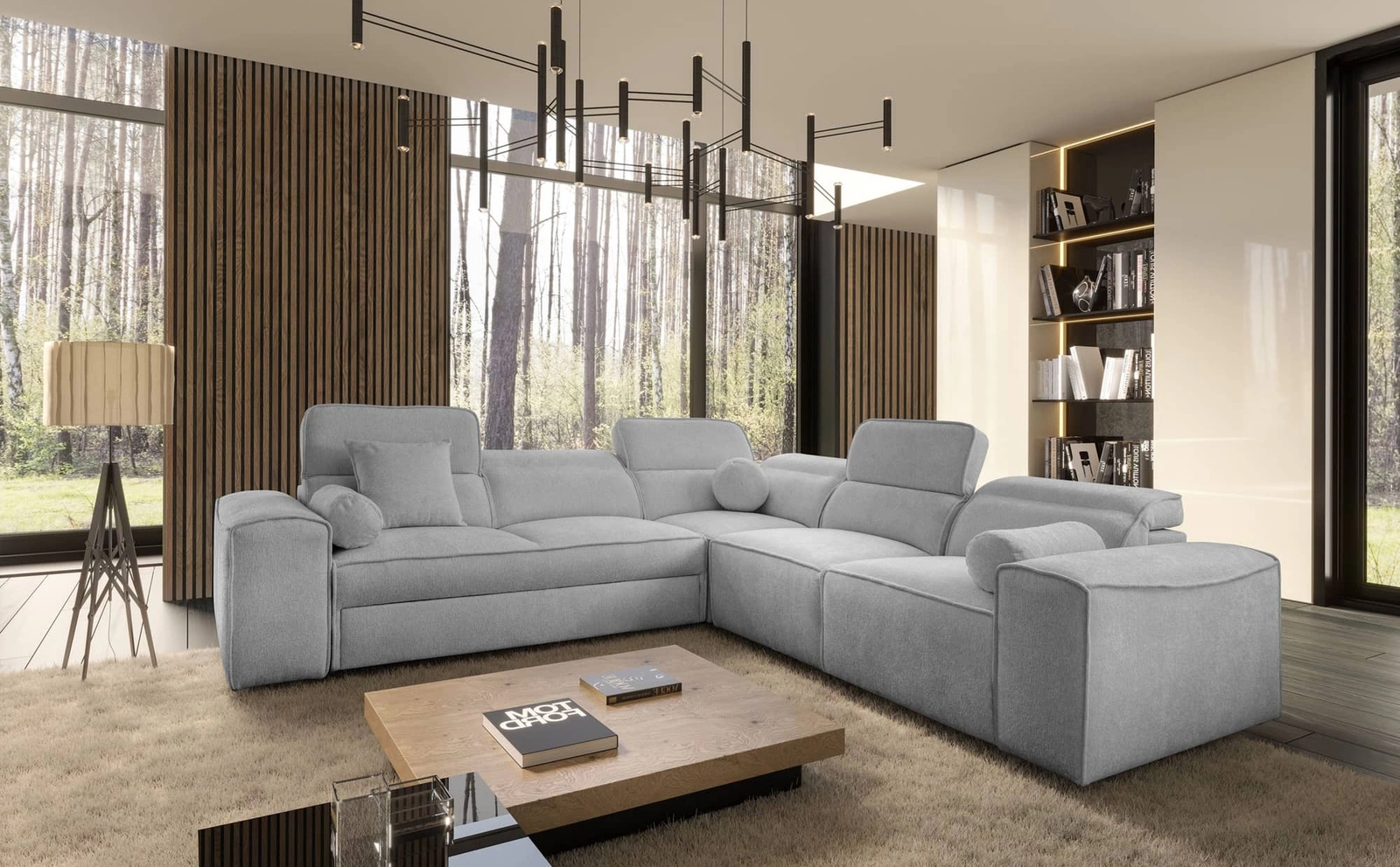 Ecksofa mit Schlaffunktion Viano III hellgraues rechtes Ecksofa mit Bettcontainern perfekt für moderne Interieurs