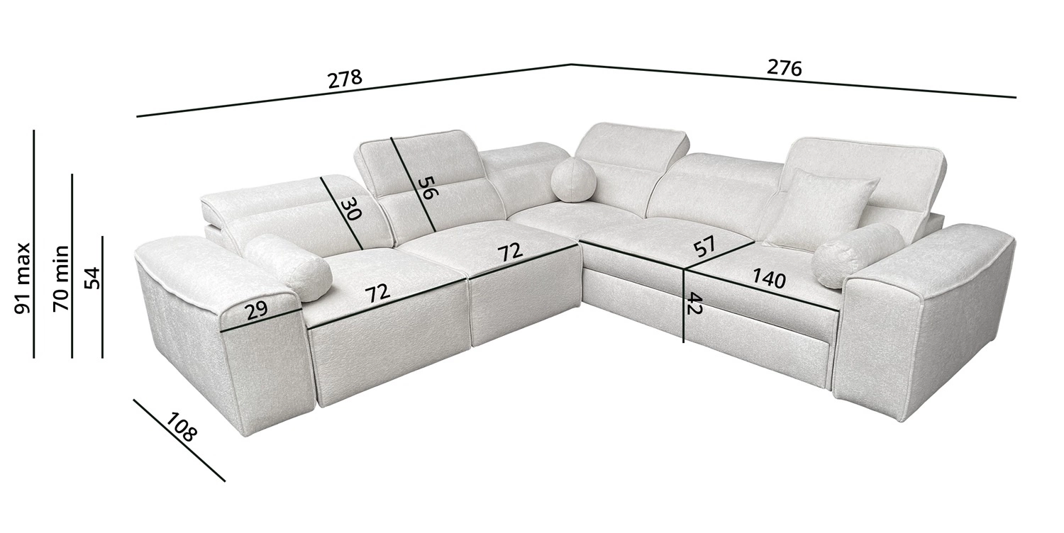 Die Abmessungen der Möbel ermöglichen raumplanung in einem kleineren Wohn- oder Aufenthaltsraum. Breite der Ecke 276 cm, höhe 91 cm und Tiefe 278 cm. Die Liegefläche des Eckschrankes beträgt 127x198 cm. Die Sitzhöhe des Möbels beträgt 42 cm und die Höhe der Rückenlehne beträgt 56 cm. Gewellte Federn und T30-Polyurethanschaum ist das Material, aus dem der Sitz der Ecke hergestellt ist. Feste Rückenlehne mit verstellbaren Kopfstützen ermöglicht eine einfache anpassung sie können die Neigung der Kopfstützen nach Ihren Wünschen einstellen und so für eine bequeme Erholung nach einem langen Tag sorgen, die Sie, Ihre Lieben und auch Ihre Gäste, die auf diesem einzigartigen Ecksofa Platz nehmen, zu schätzen wissen werden.