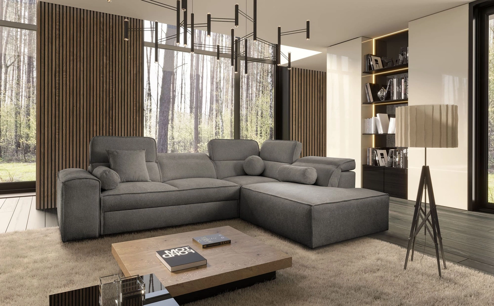 Ecksofa mit Schlaffunktion Viano VII grau rechte Ecke trendy und stilvoll mit verstellbaren Kopfstützen Zierkissen