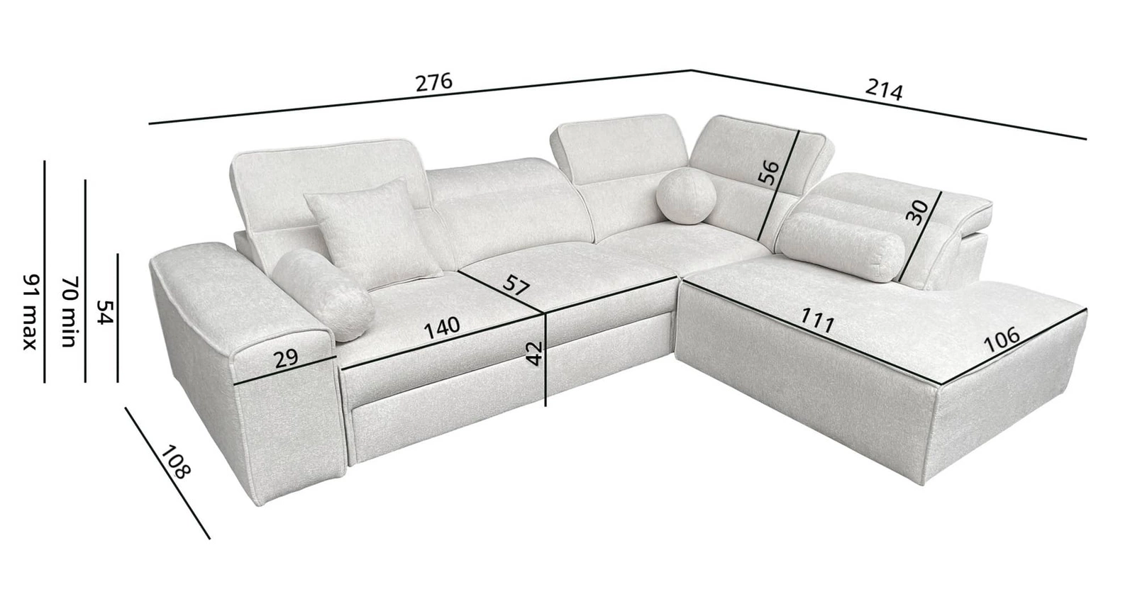 Die Abmessungen der Möbel ermöglichen raumplanung in einem geräumigen Wohnzimmer oder Sitzungssaal. Breite der Ecke 276 cm, höhe 91 cm und einer Tiefe von 214 cm. Die Liegefläche des Eckschrankes beträgt 127x198 cm. Die Sitzhöhe des Möbels beträgt 42 cm und die Höhe der Rückenlehne beträgt 56 cm. Gewellte Federn und T30-Polyurethanschaum ist das Material, aus dem der Sitz der Ecke hergestellt ist. Feste Rückenlehne mit verstellbaren Kopfstützen ermöglicht eine einfache anpassung sie können die Neigung der Kopfstützen nach Ihren Wünschen einstellen und so für eine bequeme Erholung nach einem langen Tag sorgen, die Sie, Ihre Lieben und auch Ihre Gäste, die auf diesem einzigartigen Ecksofa Platz nehmen, zu schätzen wissen werden.