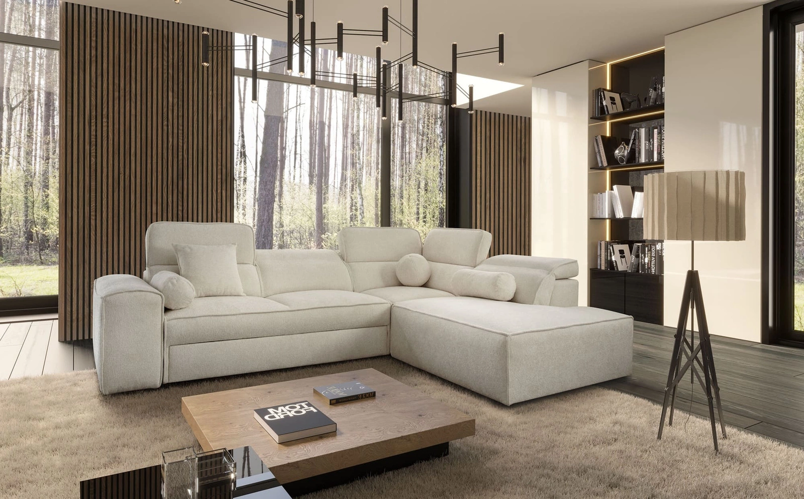 Ecksofa mit Schlaffunktion Viano VII creme rechte Ecke trendy und stilvoll mit verstellbaren Kopfstützen Zierkissen