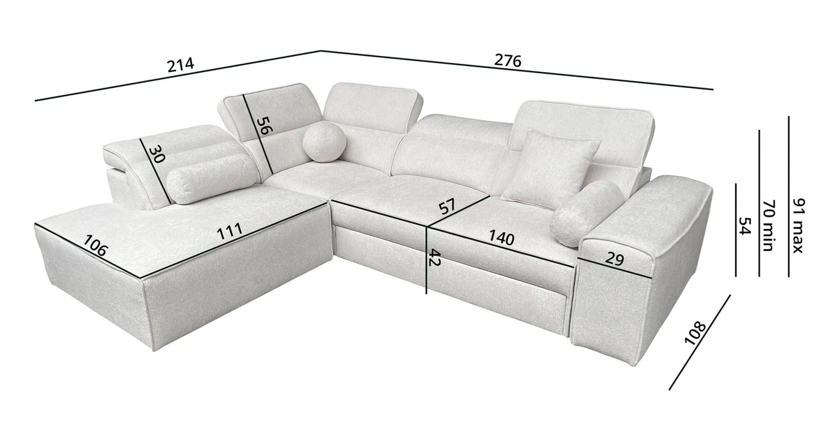 Die Abmessungen der Möbel ermöglichen raumplanung in einem geräumigen Wohnzimmer oder Sitzungssaal. Breite der Ecke 276 cm, höhe 91 cm und einer Tiefe von 214 cm. Die Liegefläche des Eckschrankes beträgt 127x198 cm. Die Sitzhöhe des Möbels beträgt 42 cm und die Höhe der Rückenlehne beträgt 56 cm. Gewellte Federn und T30-Polyurethanschaum ist das Material, aus dem der Sitz der Ecke hergestellt ist. Feste Rückenlehne mit verstellbaren Kopfstützen ermöglicht eine einfache anpassung sie können die Neigung der Kopfstützen nach Ihren Wünschen einstellen und so für eine bequeme Erholung nach einem langen Tag sorgen, die Sie, Ihre Lieben und auch Ihre Gäste, die auf diesem einzigartigen Ecksofa Platz nehmen, zu schätzen wissen werden.