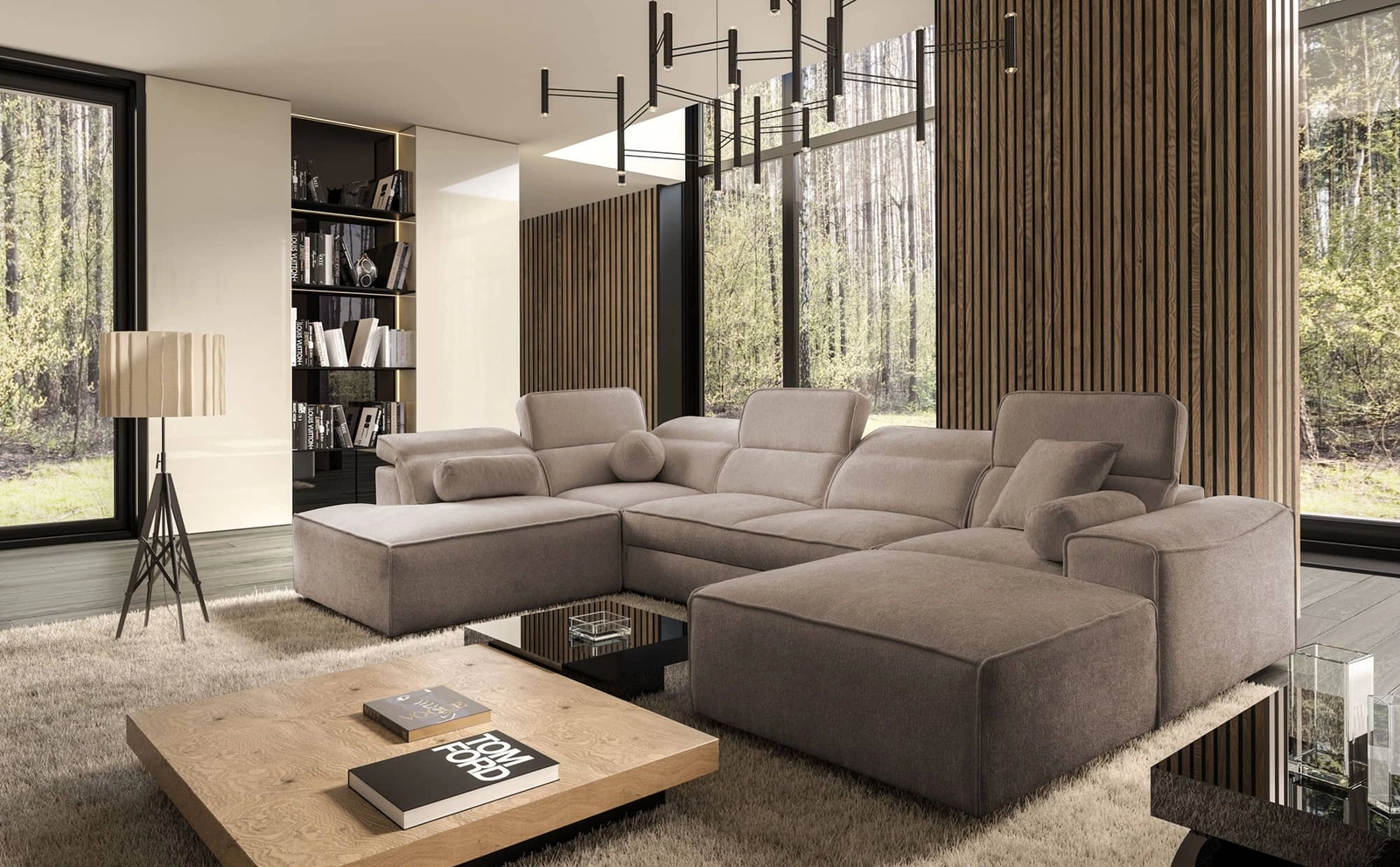 - Das Ecksofa Viano VI zeichnet sich durch seine interessante Form, seine außergewöhnliche Vielseitigkeit und seinen hohen Nutzungskomfort aus. Die Verwendung von hochwertigem Stoff mit luxuriöser Textur und ästhetischem Design verleiht der Ecke einen exklu