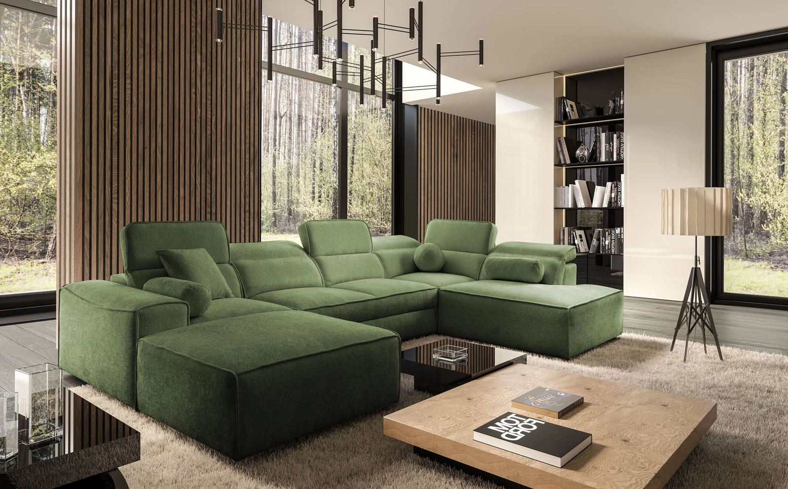 Ecksofa Viano VI in Grün ist ein interessant aussehendes Möbelstück mit einer eleganten Oberfläche.