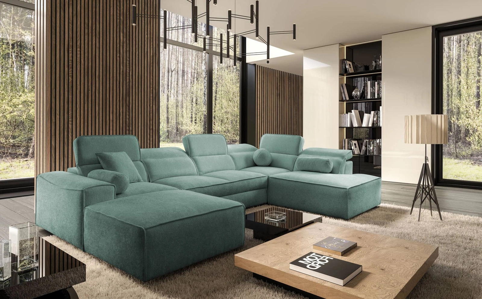Die Abmessungen der Möbel ermöglichen raumplanung in einem geräumigen Wohnzimmer oder Sitzungssaal. Breite der Ecke 343 cm, höhe 91 cm und Tiefe 216 cm. Die Liegefläche der Eckeinheit beträgt 127x268 cm. Die Sitzhöhe des Möbels beträgt 42 cm und die Höhe der Rückenlehne beträgt 56 cm. Gewellte Federn und T30-Polyurethanschaum ist das Material, aus dem der Sitz der Ecke hergestellt ist. Feste Rückenlehne mit verstellbaren Kopfstützen ermöglicht eine einfache anpassung sie können die Neigung der Kopfstützen nach Ihren Wünschen einstellen und so für eine bequeme Erholung nach einem langen Tag sorgen, die Sie, Ihre Lieben und auch Ihre Gäste, die auf diesem einzigartigen Ecksofa Platz nehmen, zu schätzen wissen werden.