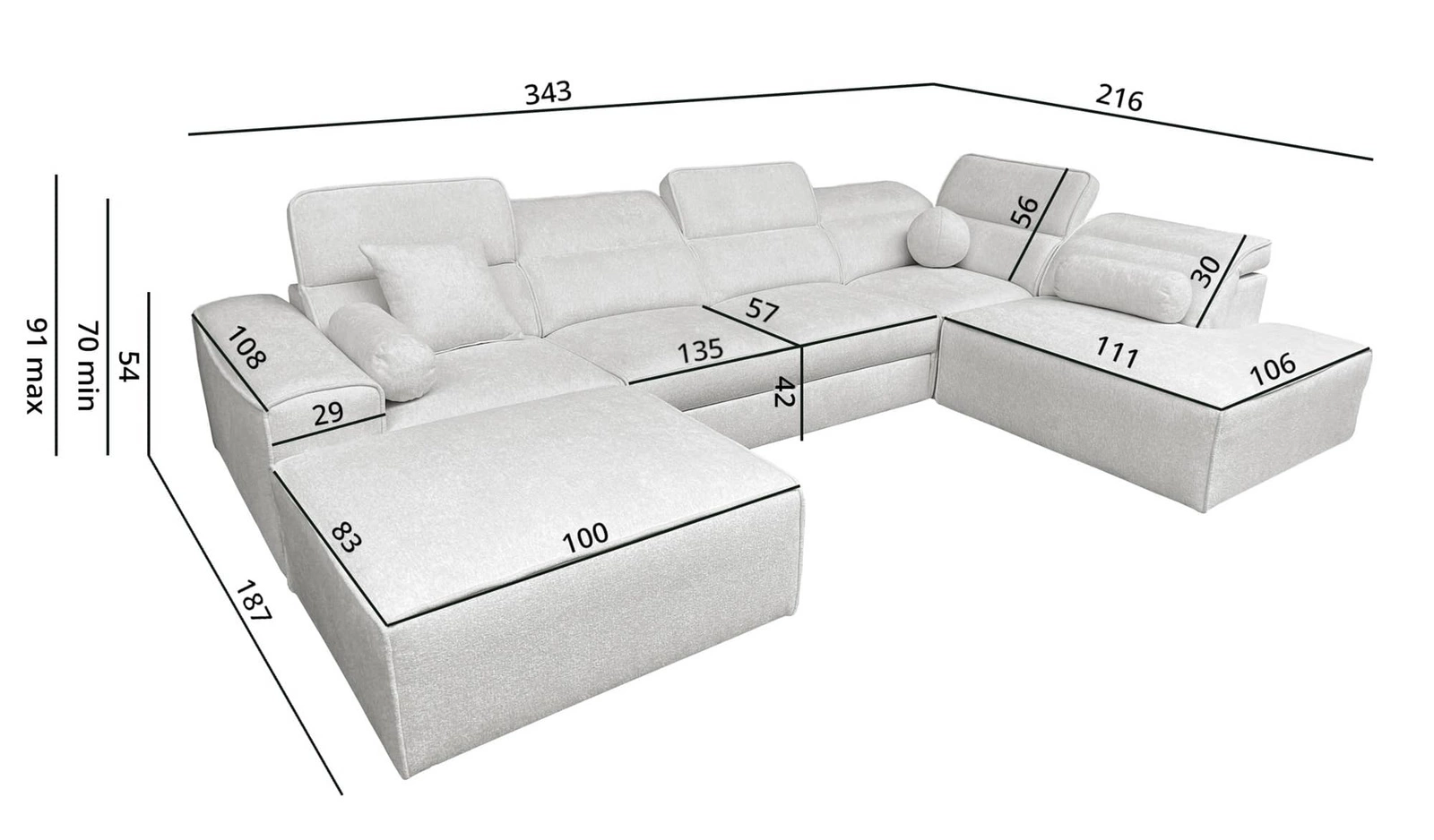 Die Abmessungen der Möbel ermöglichen raumplanung in einem geräumigen Wohnzimmer oder Sitzungssaal. Breite der Ecke 343 cm, höhe 91 cm und Tiefe 216 cm. Die Liegefläche der Eckeinheit beträgt 127x268 cm. Die Sitzhöhe des Möbels beträgt 42 cm und die Höhe der Rückenlehne beträgt 56 cm. Gewellte Federn und T30-Polyurethanschaum ist das Material, aus dem der Sitz der Ecke hergestellt ist. Feste Rückenlehne mit verstellbaren Kopfstützen ermöglicht eine einfache anpassung sie können die Neigung der Kopfstützen nach Ihren Wünschen einstellen und so für eine bequeme Erholung nach einem langen Tag sorgen, die Sie, Ihre Lieben und auch Ihre Gäste, die auf diesem einzigartigen Ecksofa Platz nehmen, zu schätzen wissen werden.