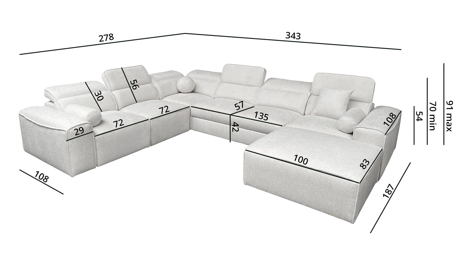 Die Abmessungen der Möbel ermöglichen raumplanung in einem geräumigen Wohnzimmer oder Sitzungssaal. Breite der Ecke 343 cm, höhe 91 cm und Tiefe 278 cm. Die Liegefläche der Eckeinheit beträgt 127x268 cm. Die Sitzhöhe des Möbels beträgt 42 cm und die Höhe der Rückenlehne beträgt 56 cm. Gewellte Federn und T30-Polyurethanschaum ist das Material, aus dem der Sitz der Ecke hergestellt ist. Feste Rückenlehne mit verstellbaren Kopfstützen ermöglicht eine einfache anpassung sie können die Neigung der Kopfstützen nach Ihren Wünschen einstellen und so für eine bequeme Erholung nach einem langen Tag sorgen, die Sie, Ihre Lieben und auch Ihre Gäste, die auf diesem einzigartigen Ecksofa Platz nehmen, zu schätzen wissen werden.
