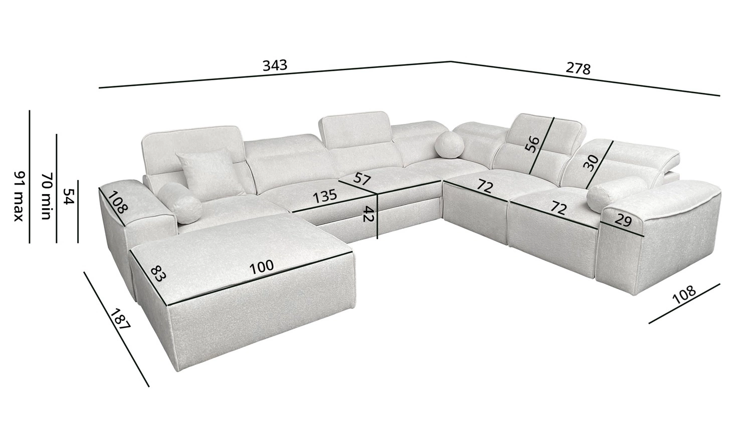 Die Abmessungen der Möbel ermöglichen raumplanung in einem geräumigen Wohnzimmer oder Sitzungssaal. Breite der Ecke 343 cm, höhe 91 cm und Tiefe 278 cm. Die Liegefläche der Eckeinheit beträgt 127x268 cm. Die Sitzhöhe des Möbels beträgt 42 cm und die Höhe der Rückenlehne beträgt 56 cm. Gewellte Federn und T30-Polyurethanschaum ist das Material, aus dem der Sitz der Ecke hergestellt ist. Feste Rückenlehne mit verstellbaren Kopfstützen ermöglicht eine einfache anpassung sie können die Neigung der Kopfstützen nach Ihren Wünschen einstellen und so für eine bequeme Erholung nach einem langen Tag sorgen, die Sie, Ihre Lieben und auch Ihre Gäste, die auf diesem einzigartigen Ecksofa Platz nehmen, zu schätzen wissen werden.