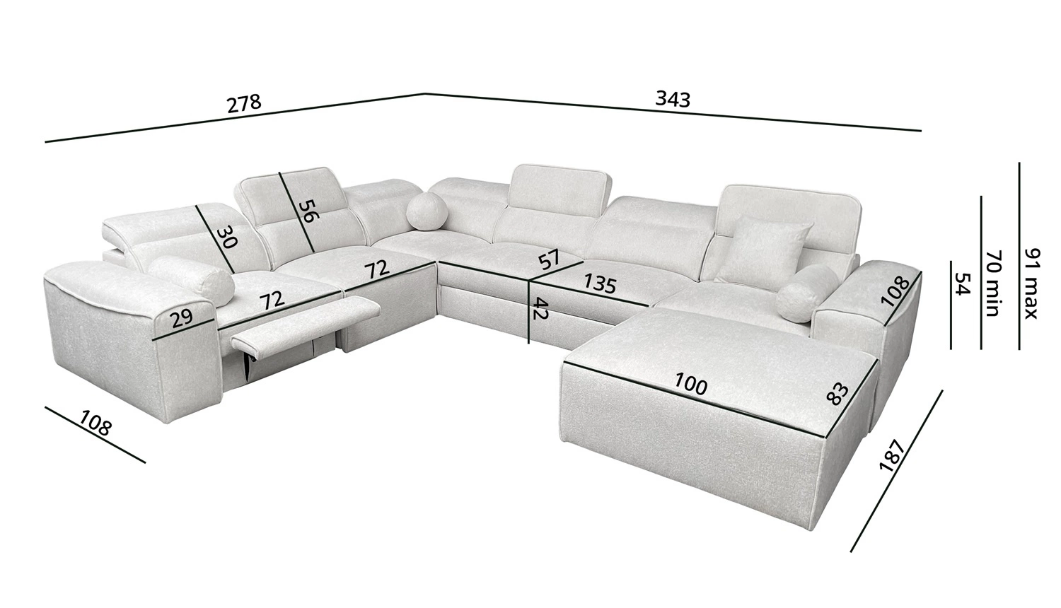Die Abmessungen der Möbel ermöglichen raumplanung in einem geräumigen Wohnzimmer oder Sitzungssaal. Breite der Ecke 343 cm, höhe 91 cm und Tiefe 278 cm. Die Liegefläche der Eckeinheit beträgt 127x268 cm. Die Sitzhöhe des Möbels beträgt 42 cm und die Höhe der Rückenlehne beträgt 56 cm. Gewellte Federn und T30-Polyurethanschaum ist das Material, aus dem der Sitz der Ecke hergestellt ist. Feste Rückenlehne mit verstellbaren Kopfstützen ermöglicht eine einfache anpassung sie können die Neigung der Kopfstützen nach Ihren Wünschen einstellen und so für eine bequeme Erholung nach einem langen Tag sorgen, die Sie, Ihre Lieben und auch Ihre Gäste, die auf diesem einzigartigen Ecksofa Platz nehmen, zu schätzen wissen werden.