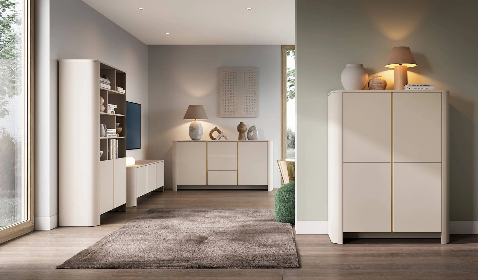 Zestaw mebli do salonu Bari w kolorze beżowym Meblościanka do salonu Meble o owalnym kształcie