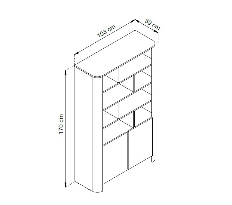 - Das Bücherregal Bari zeichnet sich durch sein modernes Design aus, das Eleganz mit Funktionalität verbindet. Die abgerundeten Kanten sorgen für Harmonie, und die hohen Beine lassen die Möbel besonders leicht erscheinen. Die goldene Umrandung der Trennwand