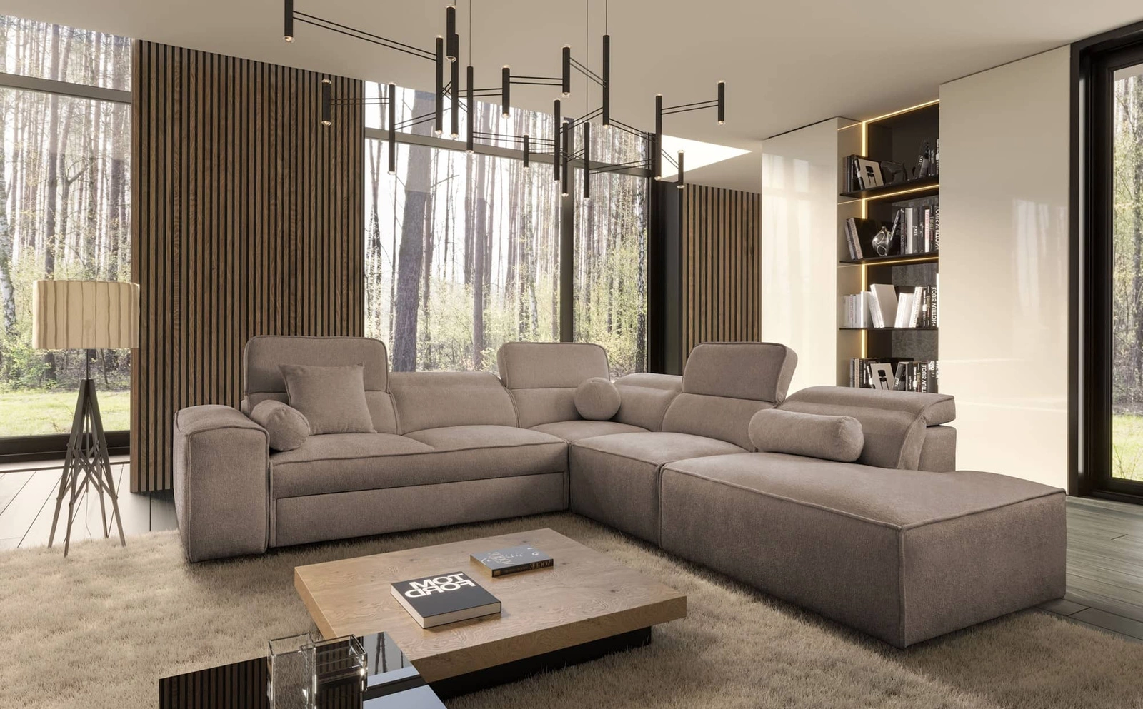 Ecksofa mit Schlaffunktion Viano IX hellbraun rechts stilvolles Ecksofa mit Bettzeugcontainer ideales Möbelstück für ein großes Wohnzimmer