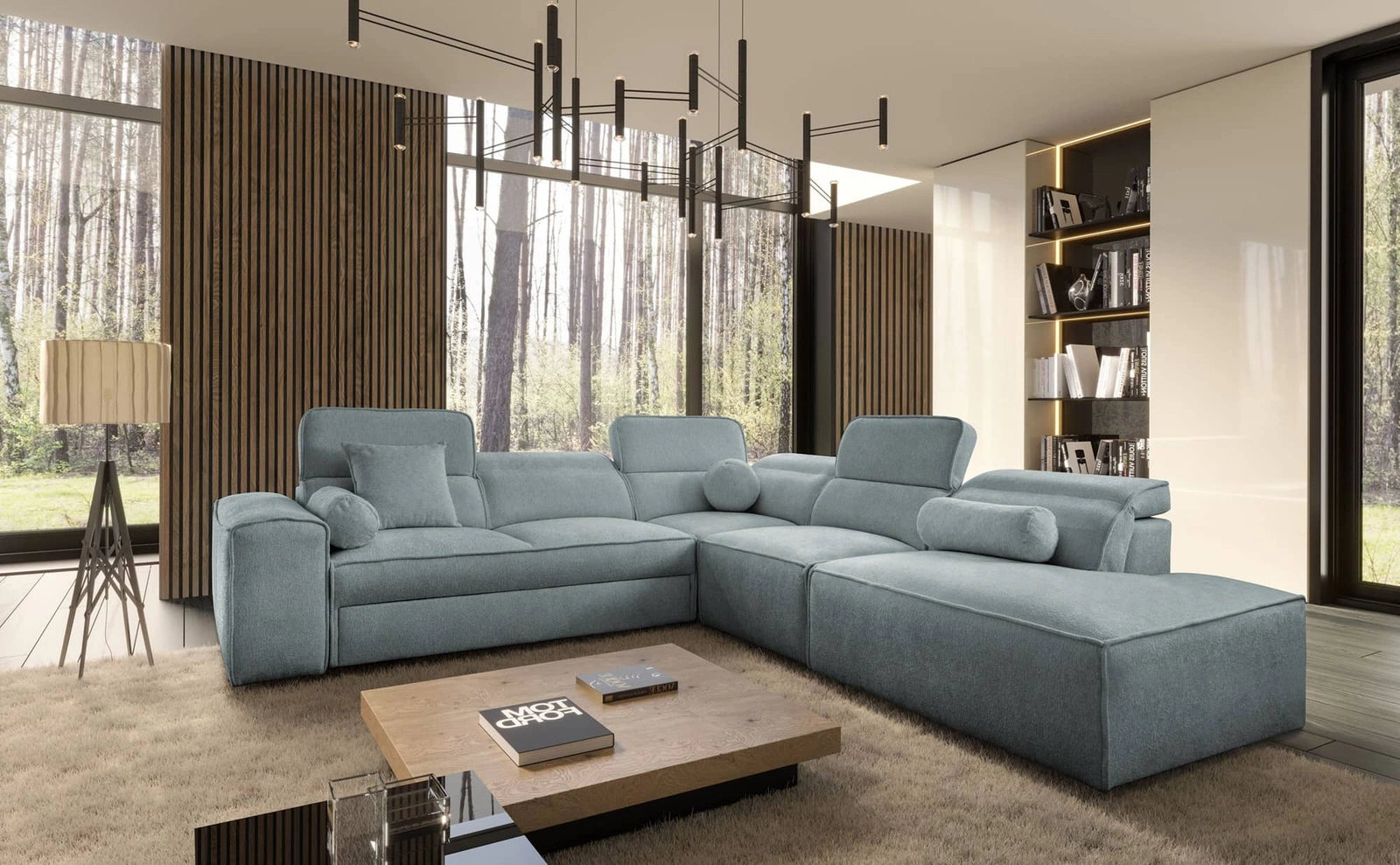 Ecksofa Viano IX in Graublau ist ein interessant aussehendes Möbelstück mit einer eleganten Oberfläche.
