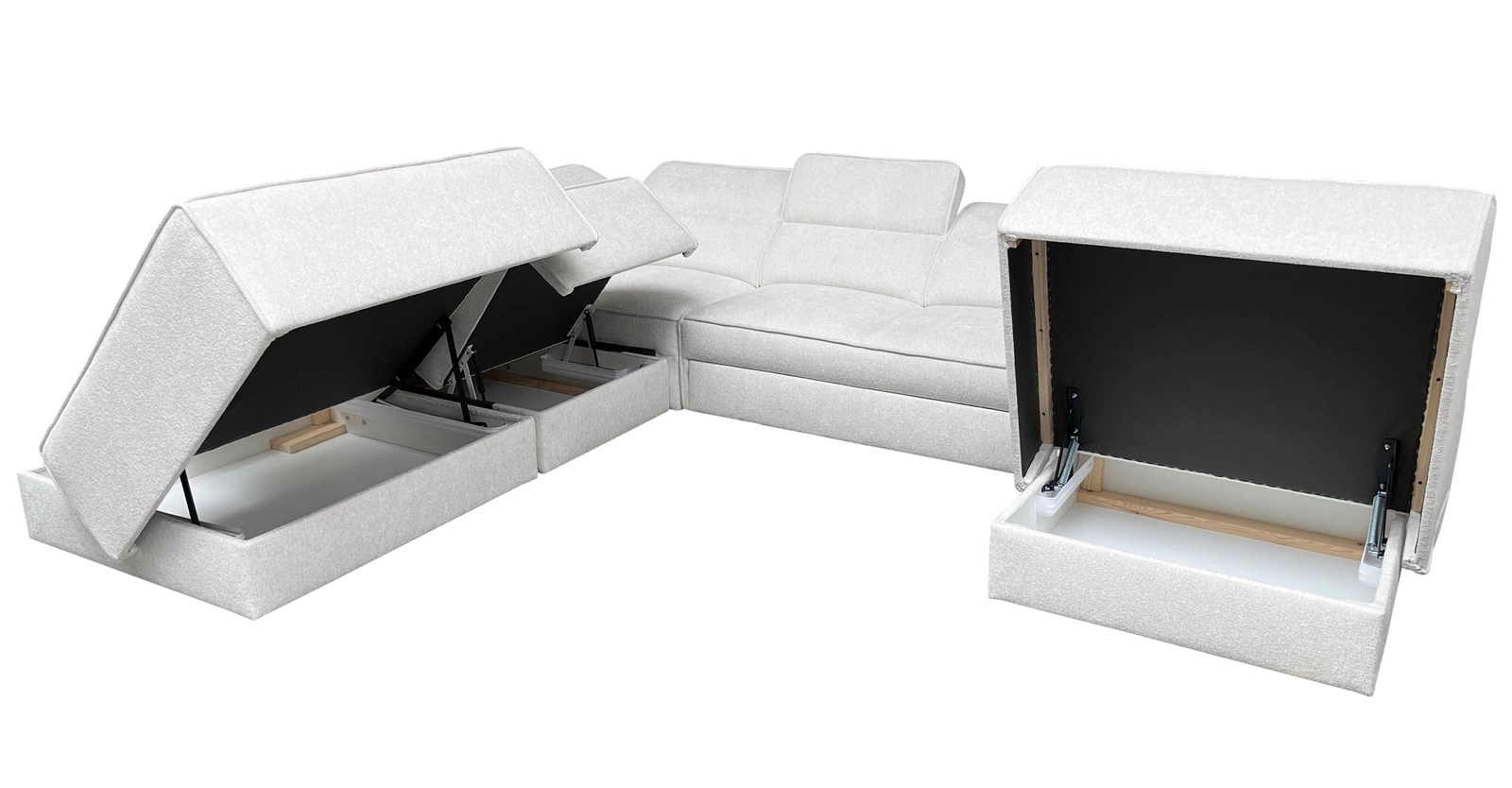 Weitere Merkmale dieses Möbels, die von allen Nutzern geschätzt werden, sind bis zu drei Bettkästen, verstellbare Kopfstützen, breite Armlehnen und Zierkissen in verschiedenen Formen.