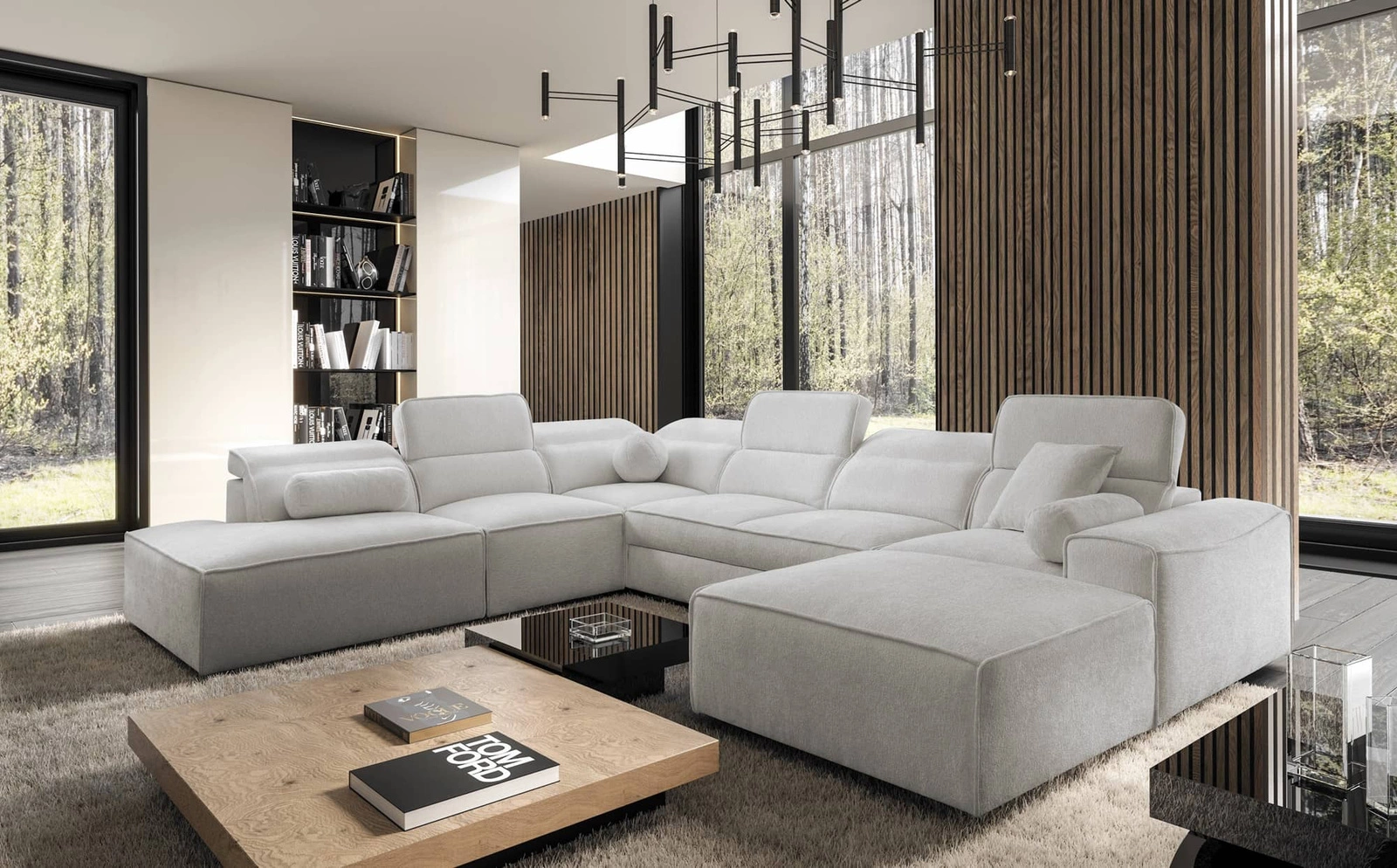 - Das Ecksofa Viano X zeichnet sich durch seine interessante Form, seine außergewöhnliche Vielseitigkeit und seinen hohen Nutzungskomfort aus. Die Verwendung von hochwertigem Stoff mit luxuriöser Textur und ästhetischem Design verleiht der Ecke einen exklus