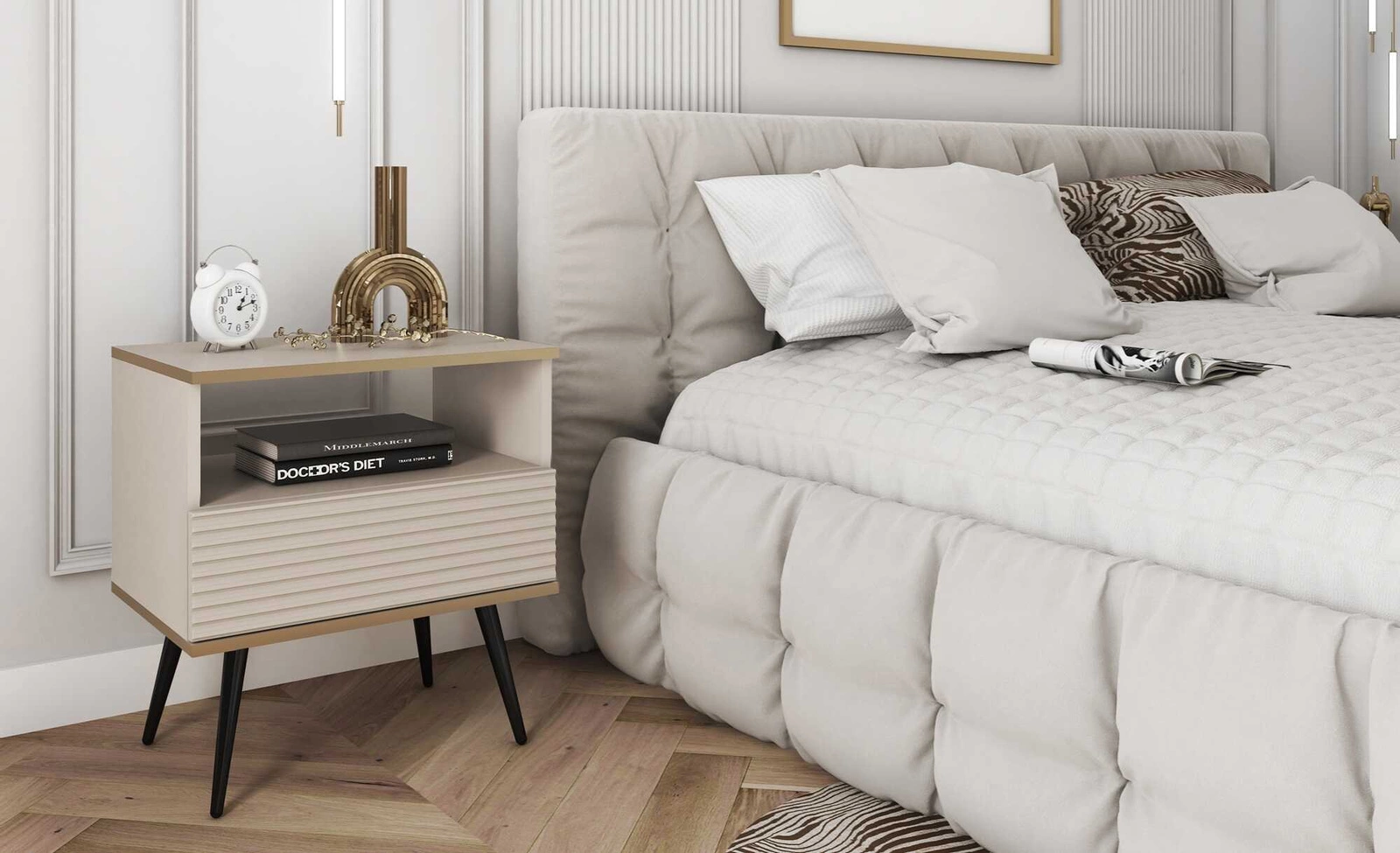 Der Nachttisch Luxury mit Schublade in Beige ist ein modernes Möbelstück, das perfekt in jedes Schlafzimmer oder Jugendzimmer passt.