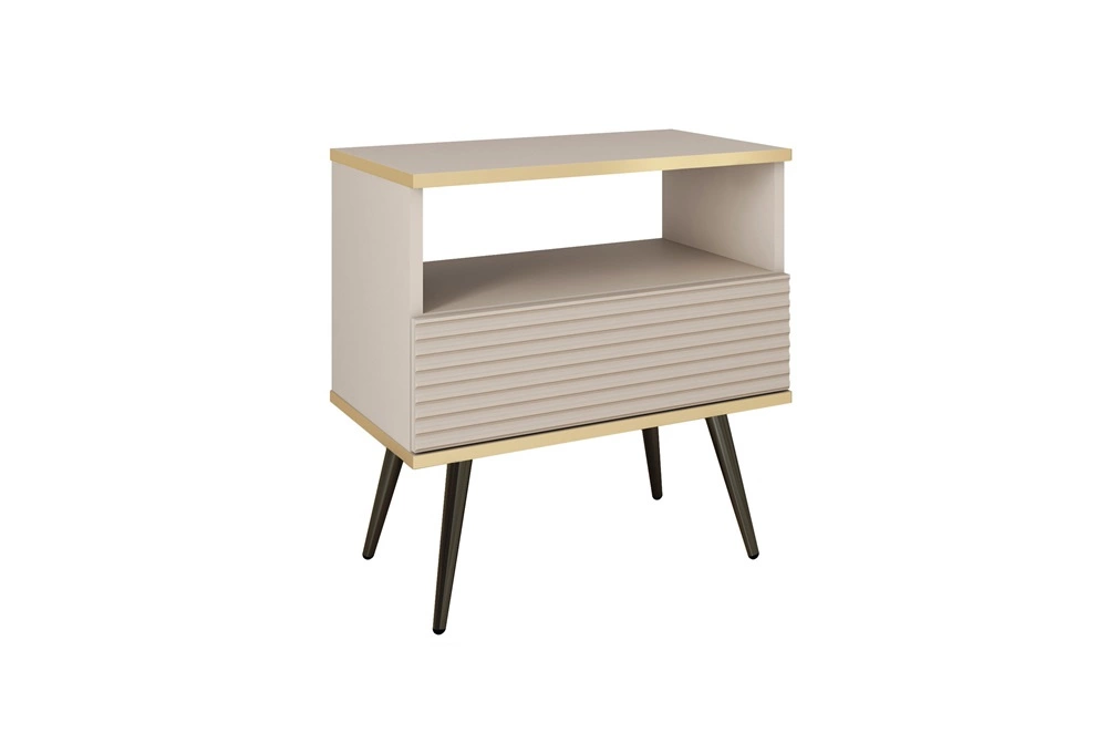Nachttisch aus der Luxury-Kollektion wird alle Liebhaber von raffinierten Arrangements begeistern. Die Möbel zeichnen sich durch ihre Schlichtheit und Eleganz aus und überraschen durch ihre breite Funktionalität. Das ikonische Beige in einem warmen Farbton, um den Raum zu erhellen und ihm ein einzigartiges Aussehen zu verleihen. Interessante Kombination geriffelte Fronten mitlATERAL die den Korpus des Nachttischs umgibt, verleiht dem Möbelstück einen einzigartigen Schliff. Beine aus Metall in kontrastierender schwarzer Farbe optische Leichtigkeit bei gleichzeitiger Funktionalität.
