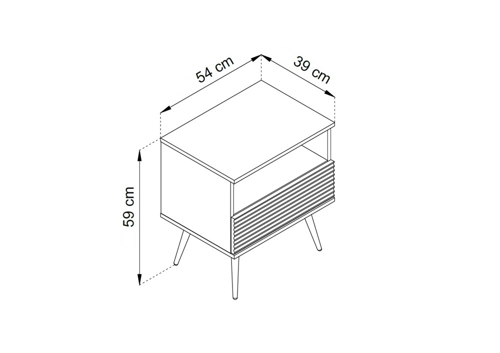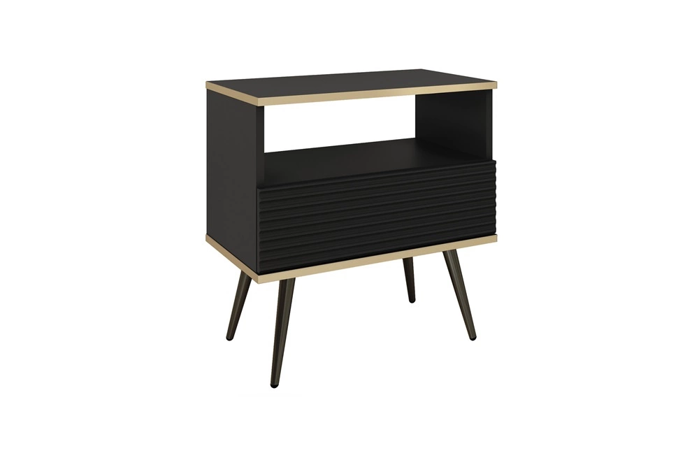 Nachttisch aus der Luxury-Kollektion wird alle Liebhaber von raffinierten Arrangements begeistern. Die Möbel zeichnen sich durch ihre Schlichtheit und Eleganz aus und überraschen durch ihre breite Funktionalität. Klassisch schwarz verleiht dem Innenraum ein einzigartiges Aussehen und Gefühl. Interessante Kombination geriffelte Fronten mitlATERAL die den Korpus des Nachttischs umgibt, verleiht dem Möbelstück einen einzigartigen Schliff. Beine aus Metall w schwarz optische Leichtigkeit bei gleichzeitiger Funktionalität.