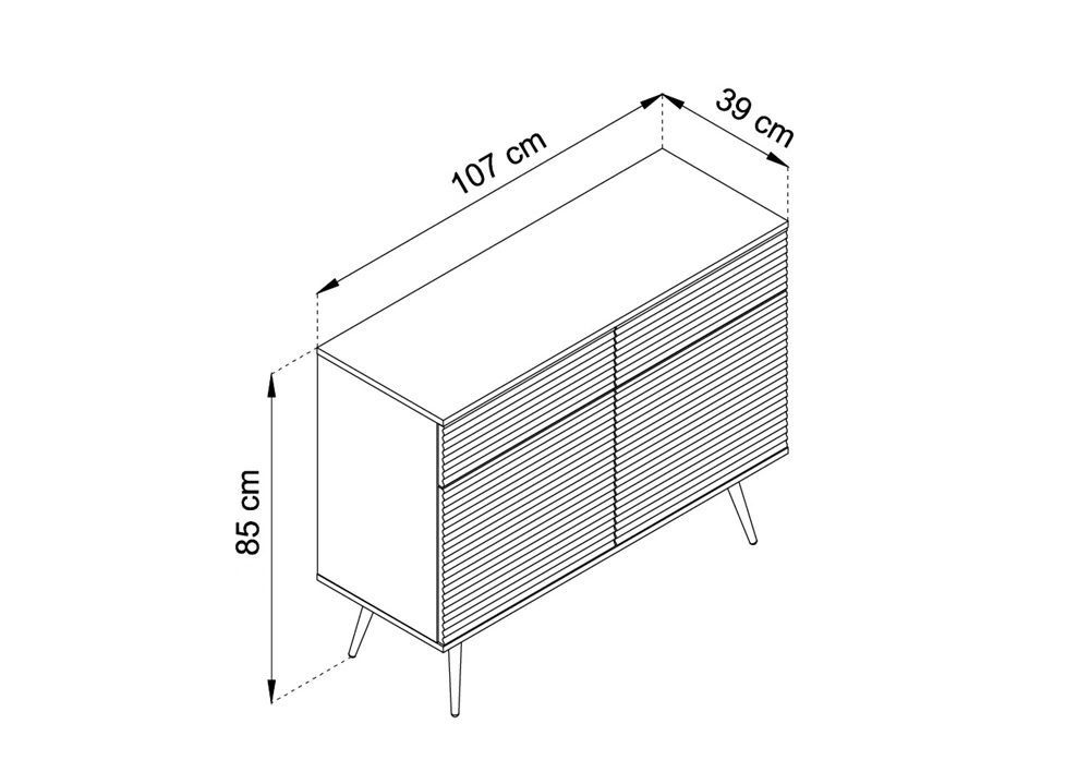 Das Vorhandensein einer Kommode wird zu einem stilvollen Abschluss des Raumes und verleiht ihm einen besonderen Charakter. Die einfache Form der Möbel passt perfekt zum minimalistischen Design. Der Korpus der Wohnzimmerkommode ist aus aus hochwertig laminierter Platte gefertigt, die sehr widerstandsfähig gegen äußere Einflüsse ist. Stilvoll geriffelte Fronten hergestellt aus mDF-Platte. Das Öffnen der Türen und Schubladen der Kommode erfolgt durch ein grifflosen Push-to-Open-System. Die Luxus-Wohnzimmerkommode ist optisch ansprechend und funktional.