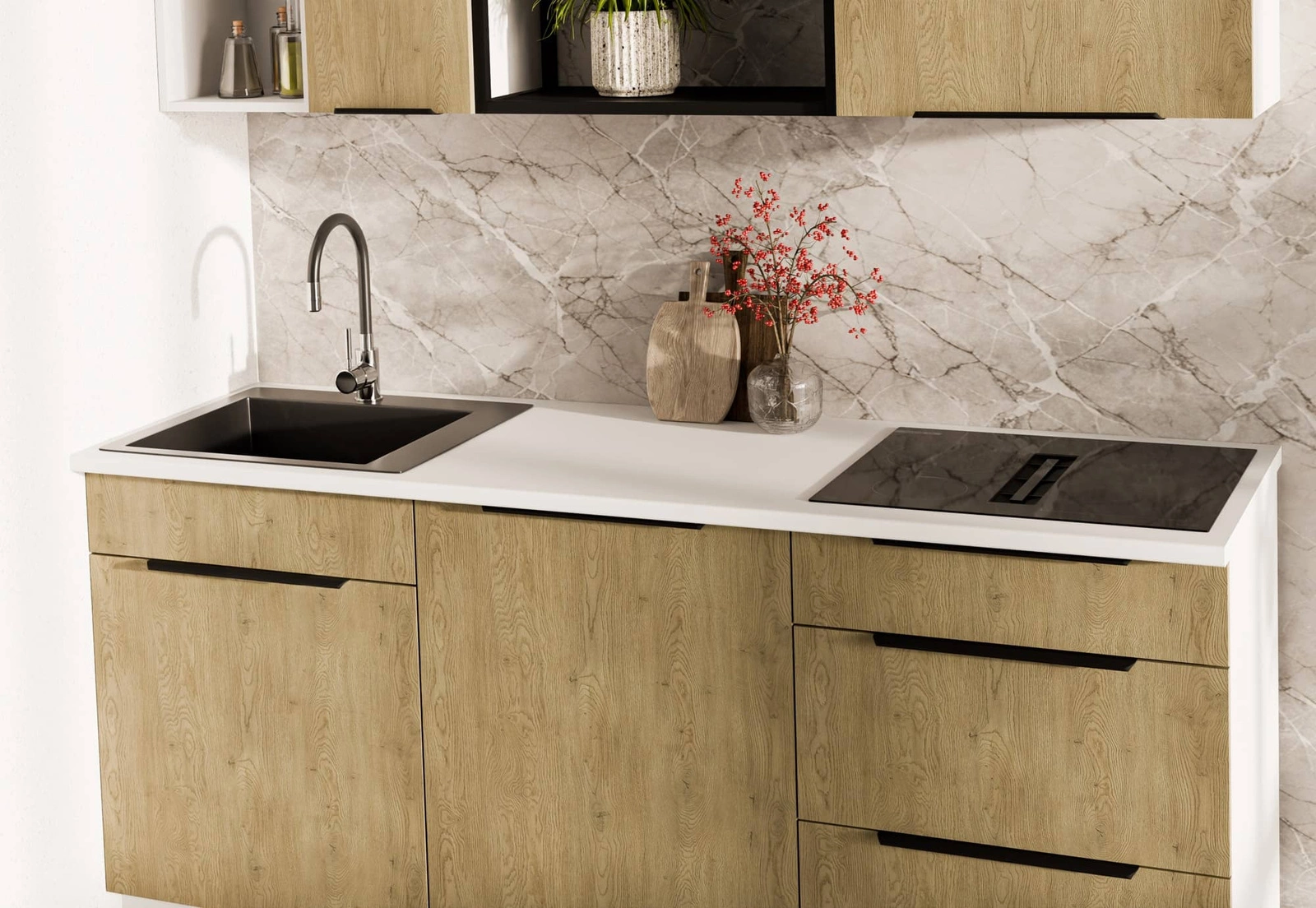 Der Korpus und die Fronten der Küchenschränke sind aus hochwertiger 16 mm dicker laminierter Platte. Der Vorteil dieser Art von Material ist hohe Widerstandsfähigkeit gegen äußere Einflüsse wie Dampf, Hitze, Feuchtigkeit, verschüttete Flüssigkeiten. Auch das verwendete Material ist resistent auf zufällige Beschädigung. Eine stilvolle Ergänzung zu den Küchenschrankfronten ist die schwarz, metallkantenhalterungen, die neben ihrer Hauptfunktion auch das moderne Design des Schrankes unterstreichen.