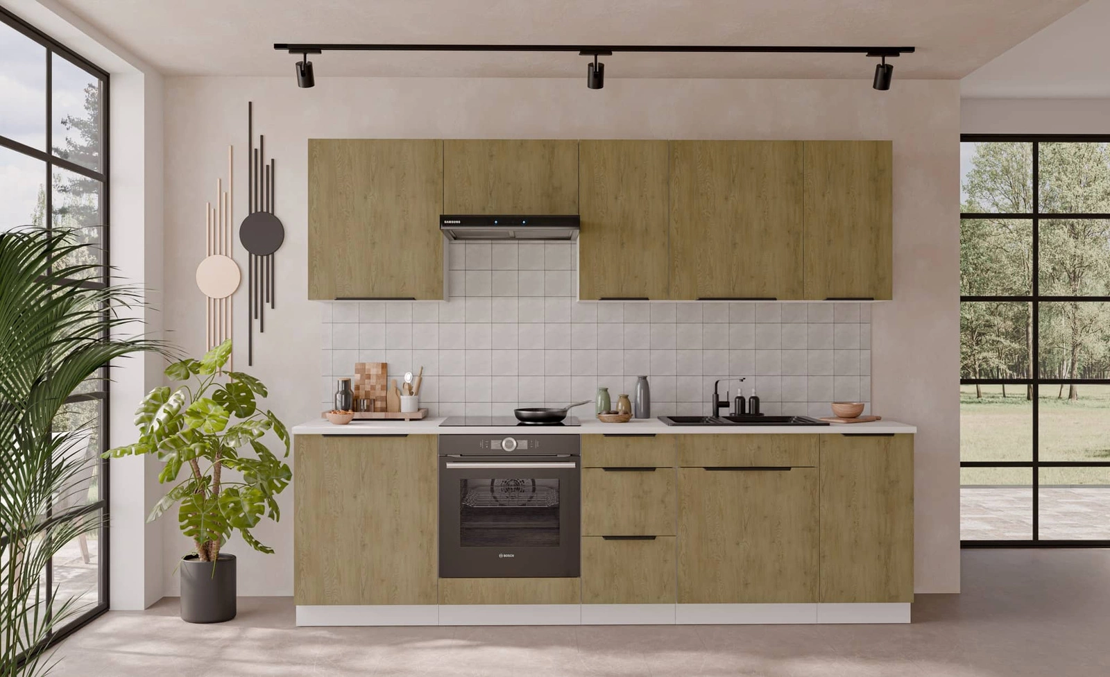 Der Korpus und die Fronten der Küchenschränke sind aus hochwertiger 16 mm dicker laminierter Platte. Der Vorteil dieser Art von Material ist hohe Widerstandsfähigkeit gegen äußere Einflüsse wie Dampf, Hitze, Feuchtigkeit, verschüttete Flüssigkeiten. Auch das verwendete Material ist resistent auf zufällige Beschädigung. Eine stilvolle Ergänzung zu den Küchenschrankfronten ist die schwarz, metallkantengriff, der neben seiner Hauptfunktion auch das moderne Design des Schrankes unterstreicht.
