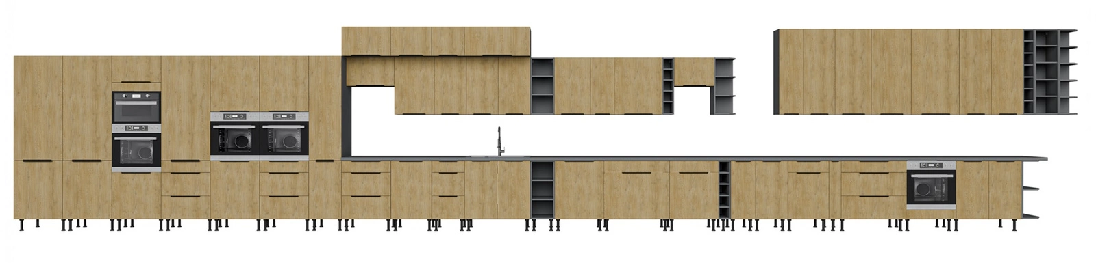 Der Korpus und die Fronten der Küchenzeile sind aus hochwertiger 16 mm dicker laminierter Platte. Der Vorteil dieser Art von Material ist hohe Widerstandsfähigkeit gegen äußere Einflüsse wie Dampf, Hitze, Feuchtigkeit, verschüttete Flüssigkeiten. Auch das verwendete Material ist resistent auf zufällige Beschädigung. Eine stilvolle Ergänzung zu den Küchenschrankfronten ist die schwarz, metallkantenhalterungen, die neben ihrer Hauptfunktion auch das moderne Design des Schrankes unterstreichen.