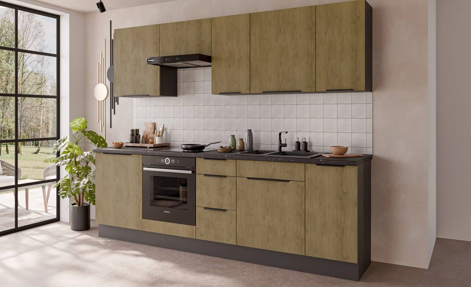 Das Corsico Küchenmöbelset in Anthrazit / Eiche Cremona ist ein Vorschlag für ein fertiges Küchenmöbelset, das sich hervorragend in moderne Innenräume einfügt.