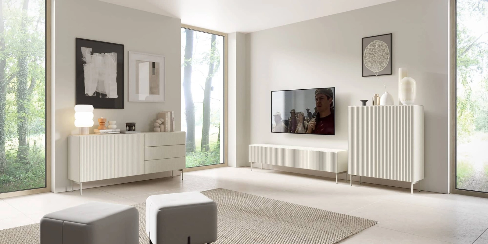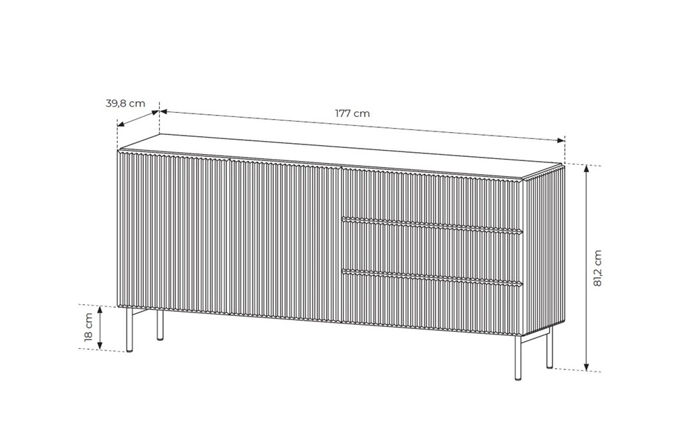 Kannelierte Kommode sind hergestellt aus 18 mm dicke MDF-Platte, die resistent gegen äußere Einflüsse wie Druckstellen, Stöße und unglückliche Kratzer ist. Zartes Kaschmir passt perfekt zu modischen Einrichtungsgegenständen und macht die Kommode Muti zu einer perfekten Wohnkommode mit originellem Finish, zu einer Wohnzimmerkommode oder zu einer modernen Schlafzimmerkommode. Eine Kommode kann auch erfolgreich als Büromöbel eingesetzt werden.