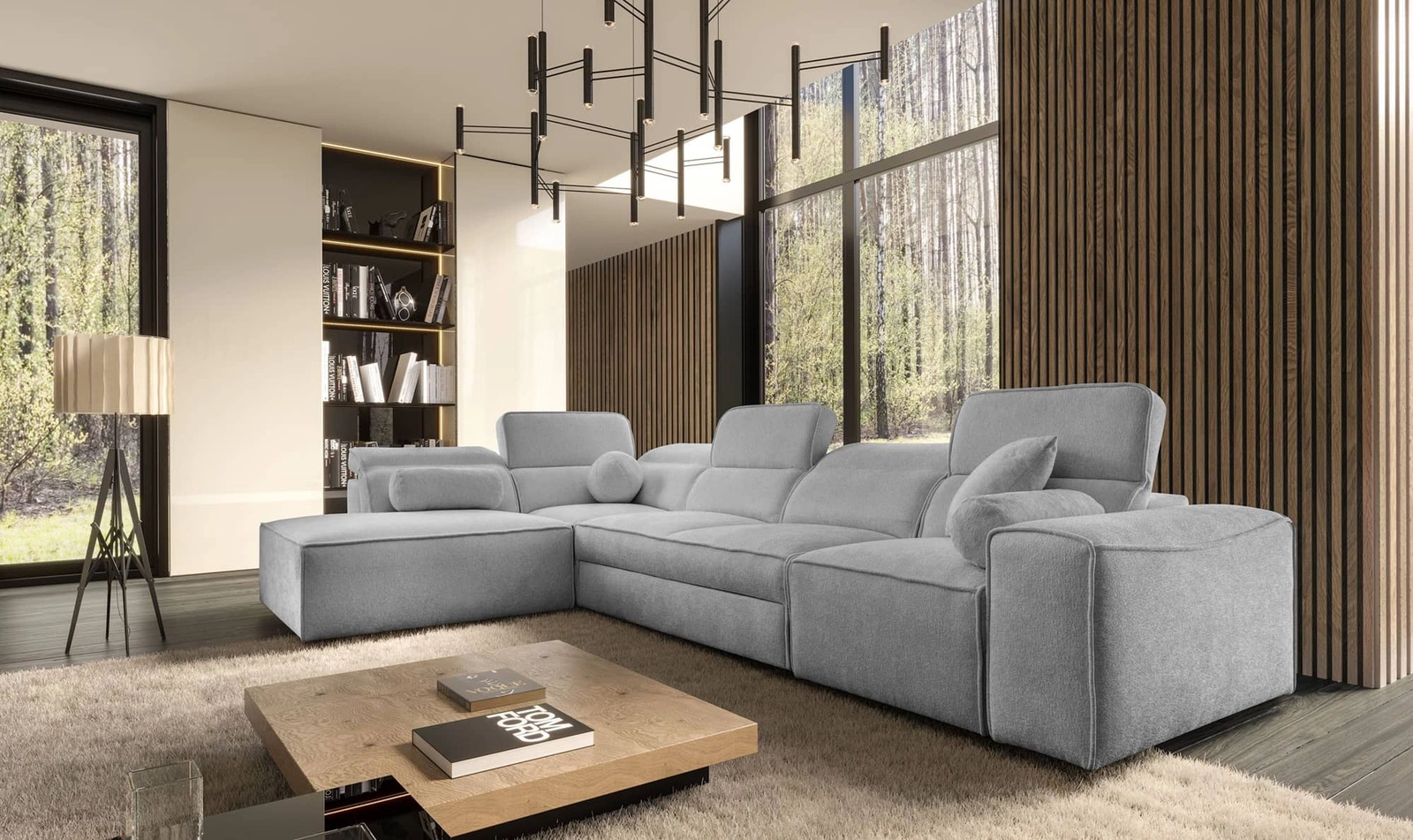 Ecksofa mit Schlaffunktion Viano XI hellgrau links trendiges und stilvolles Ecksofa mit verstellbaren Kopfstützen Zierkissen