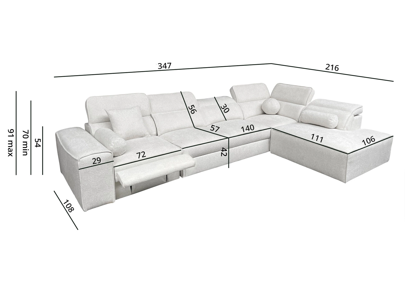 Die Abmessungen der Möbel ermöglichen raumplanung in einem geräumigen Wohnzimmer oder Sitzungssaal. Breite der Ecke 347 cm, höhe 91 cm und Tiefe 216 cm. Die Liegefläche des Eckschrankes beträgt 127x198 cm. Die Sitzhöhe des Möbels beträgt 42 cm und die Höhe der Rückenlehne beträgt 56 cm. Gewellte Federn und T30-Polyurethanschaum ist das Material, aus dem der Sitz der Ecke hergestellt ist. Feste Rückenlehne mit verstellbaren Kopfstützen ermöglicht eine einfache anpassung sie können die Neigung der Kopfstützen nach Ihren Wünschen einstellen und so für eine bequeme Erholung nach einem langen Tag sorgen, die Sie, Ihre Lieben und auch Ihre Gäste, die auf diesem einzigartigen Ecksofa Platz nehmen, zu schätzen wissen werden.