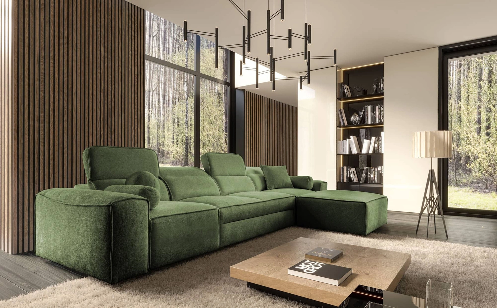 Ecksofa mit Schlaffunktion Viano XII grün rechts stilvolles Ecksofa mit interessanter Form verstellbare Kopfstützen Zierkissen