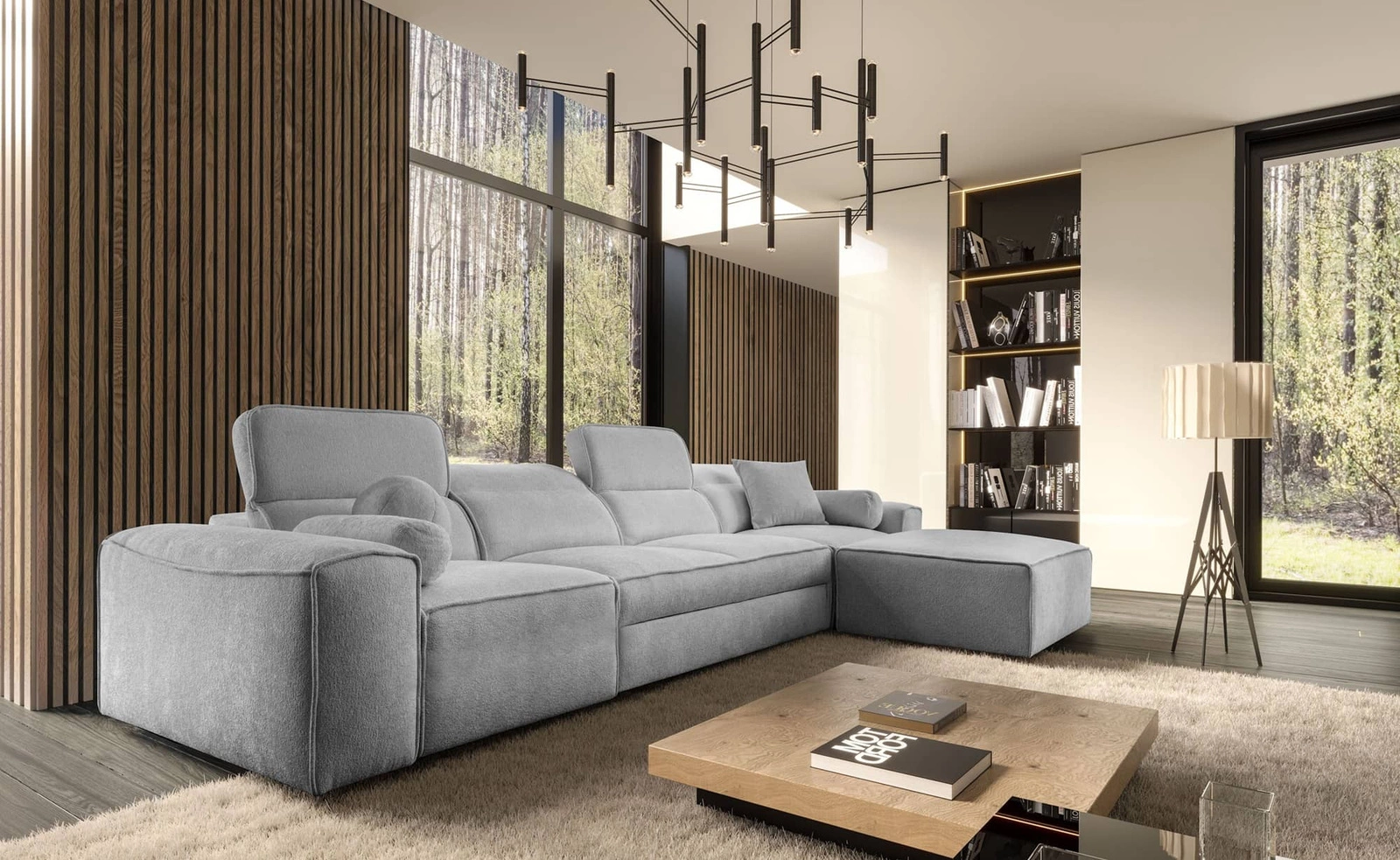 Ecksofa mit Schlaffunktion Viano XII hellgrau rechtes Ecksofa mit interessanter Form verstellbare Kopfstützen Zierkissen