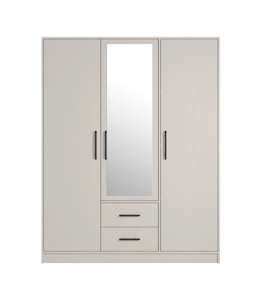 - Der 150 cm breite Kleiderschrank Caspe hat ein modernes Design. Hergestellt aus 16 mm starker laminierter Platte. Kante mit ABS-Furnier ummantelt. Schrankschubladen auf Rollenführung. Die Möbel haben Aluminiumgriffe. Spiegel an der mittleren Tür.