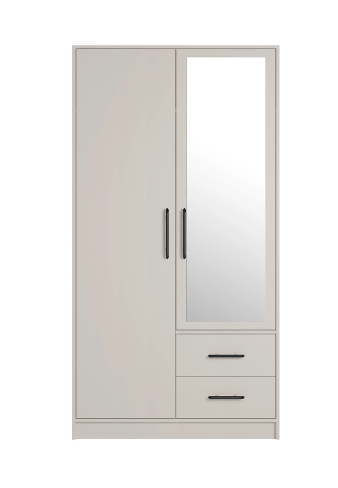 Garderobe in beige mit einem Kaschmir-Ton hat eine Flügeltür mit einer matten Oberfläche matt. Die Möbel bestehen aus 2 Türen und 2 Schubladen. Rechts tür ist mit einem großen spiegel. Die Schrankfronten werden ergänzt durch aluminium-Griffe. Der Kleiderschrank ist aus hochwertigem laminierter Platte, die gekennzeichnet ist durch hohe widerstand gegen äußere Einflüsse wie Prellungen, Stöße und unglückliche Kratzer.
