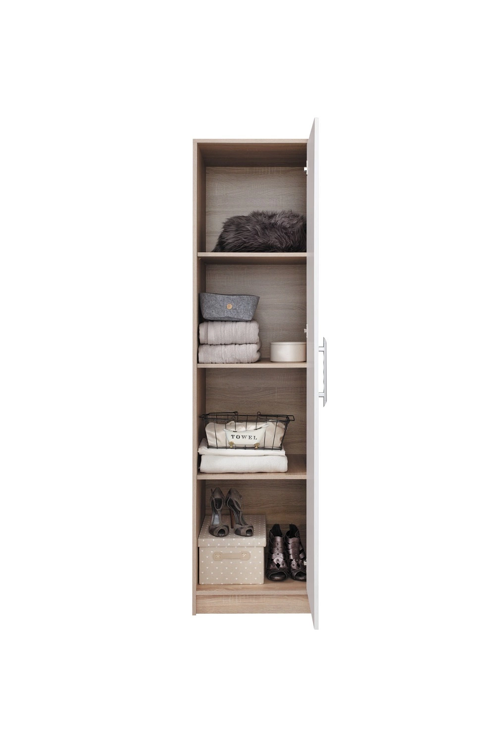 - Der 50 cm breite Kleiderschrank Caspe ist ein Rezept für eine ergonomische und funktionelle Einrichtung. Die schlichte Form und die geometrischen Formen der Garderobe spiegeln perfekt die aktuellen Trends wider. Funktioniert gut im Schlafzimmer, Wohnzimme