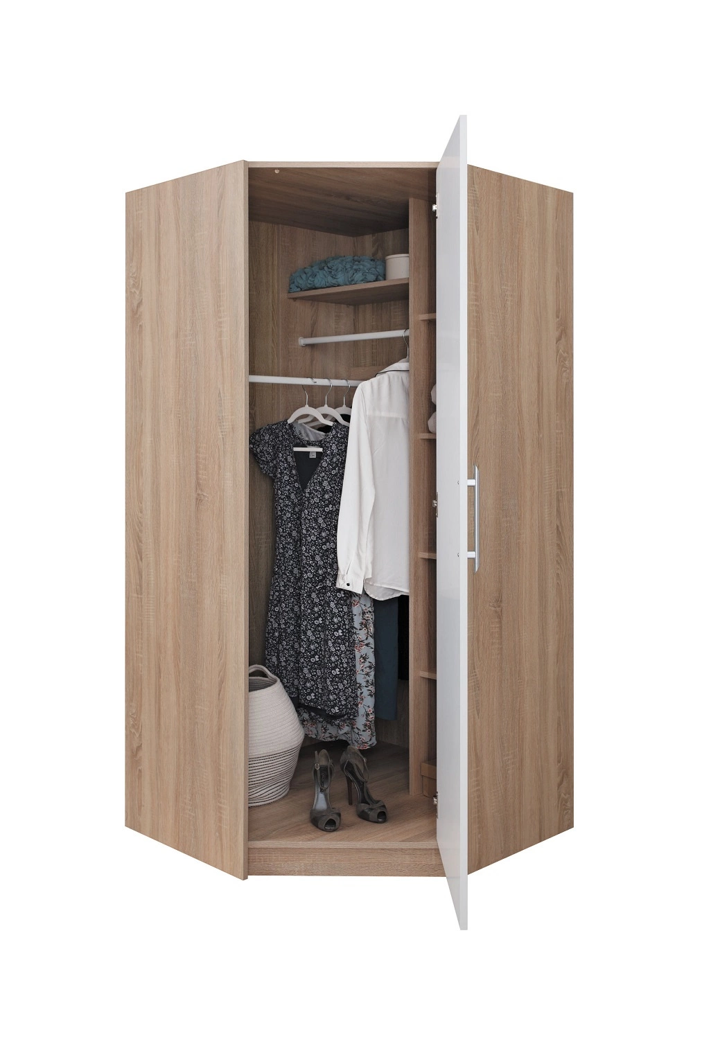 - Der Eckschrank Caspe ist ein Rezept für eine ergonomische und funktionelle Einrichtung. Die schlichte Form und die geometrischen Formen der Garderobe spiegeln perfekt die aktuellen Trends wider. Funktioniert gut im Schlafzimmer, Wohnzimmer, Ankleidezimmer