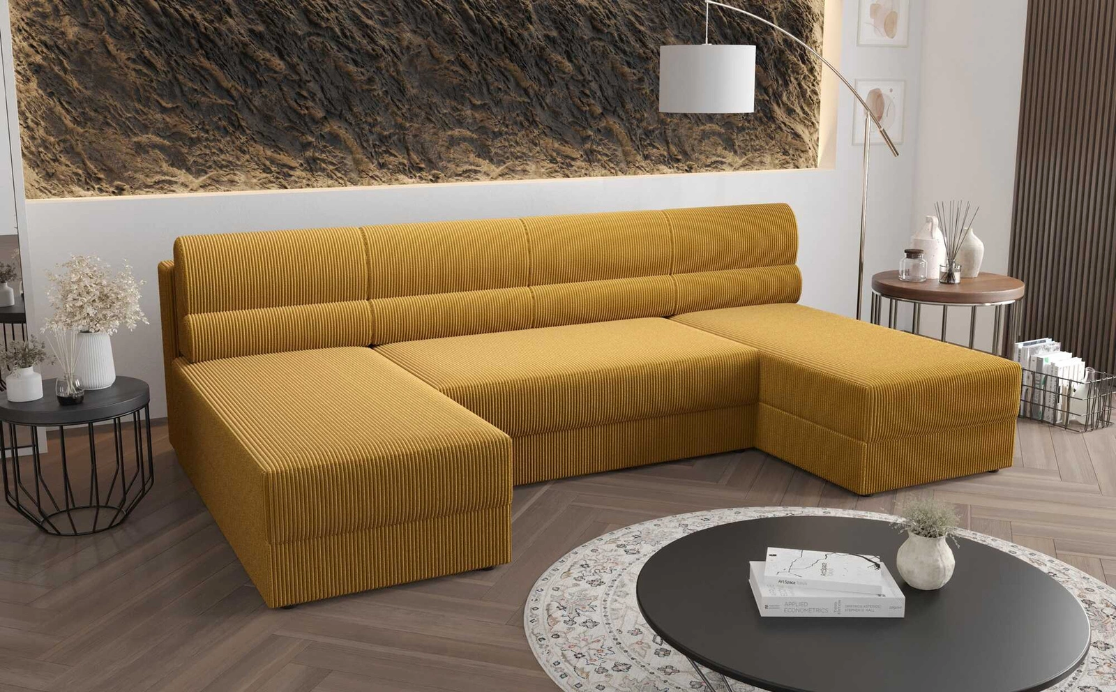 Ecksofa mit Schlaffunktion Fogu U Honig-Gelb komfortables und stilvolles Ecksofa mit einfachem Design Cordstoff Bettzeug Container