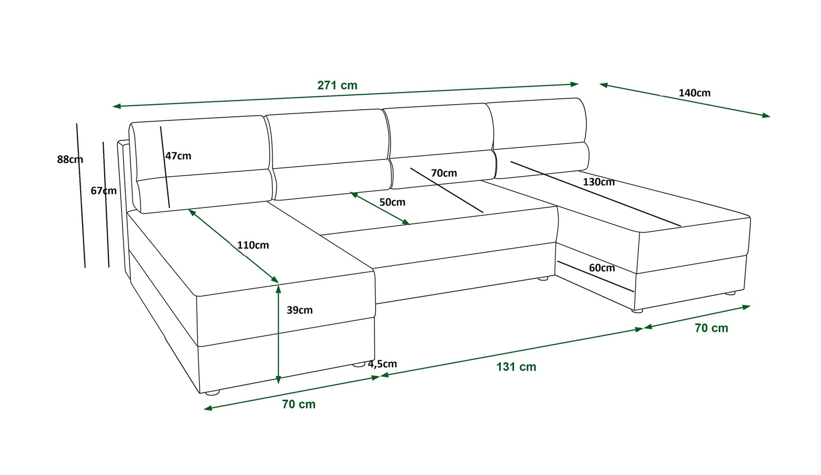 Das Ecksofa mit Schlaffunktion eignet sich dank seiner Abmessungen und seiner breiten Funktionalität ideal als Ecksofa für das Wohnzimmer oder als klappbares Ecksofa für das Gästezimmer. Ein Ecksofa mit Schlaffunktion ist auch eine gute Alternative zu einem Bett im Zimmer der jugendzimmer. Breite der Ecke 271 cm, höhe 88 cm und Tiefe 140 cm. Die Liegefläche der Eckeinheit beträgt 130x270 cm. Die Sitzhöhe des Möbels beträgt 39 cm, und die Höhe der Rückenlehne beträgt 47 cm. Polyurethan-Schaumstoff T30 ist das Material, aus dem der Sitz der Ecke hergestellt ist. Weich rückenlehnen-Kissen gewährleisten einen hohen Komfort bei der täglichen Erholung, den Sie und Ihre Gäste, die auf diesem einzigartigen Ecksofa sitzen, zu schätzen wissen werden.