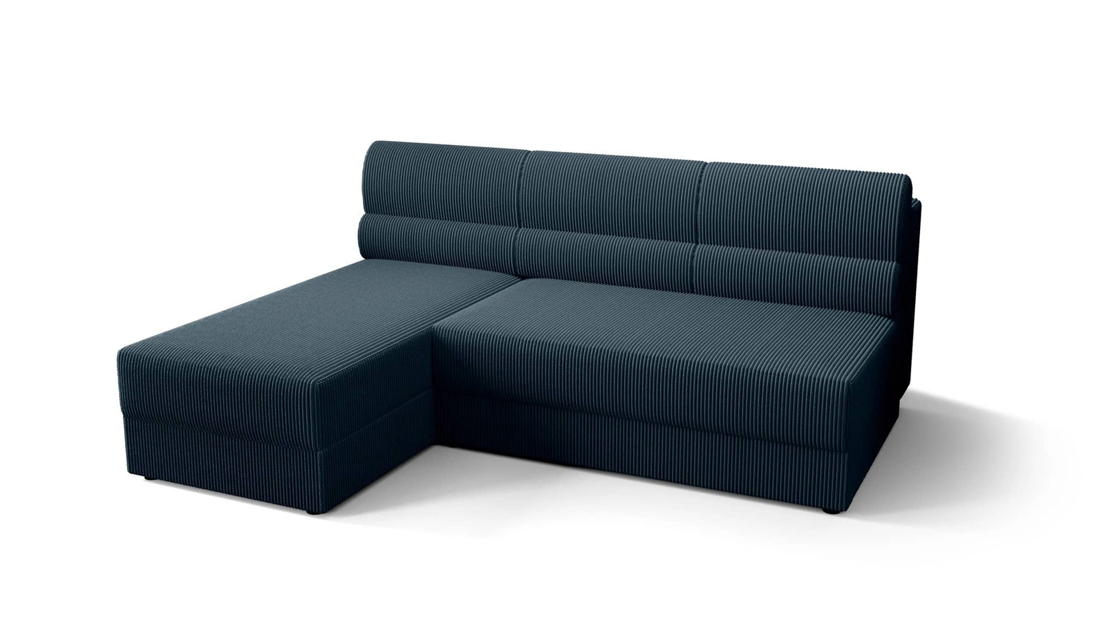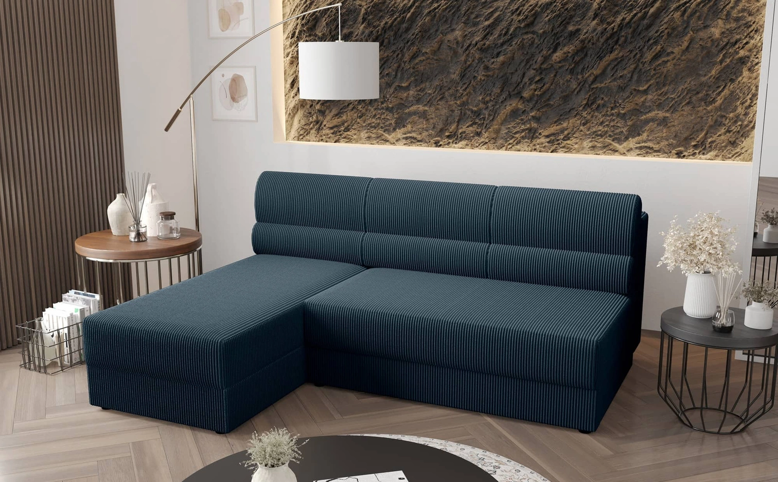 Ecksofa mit Schlaffunktion Fogu blau linke Seite stilvolle Ecksofa mit einfachem Design mit Cord-Stoff Bettzeug Container abgedeckt