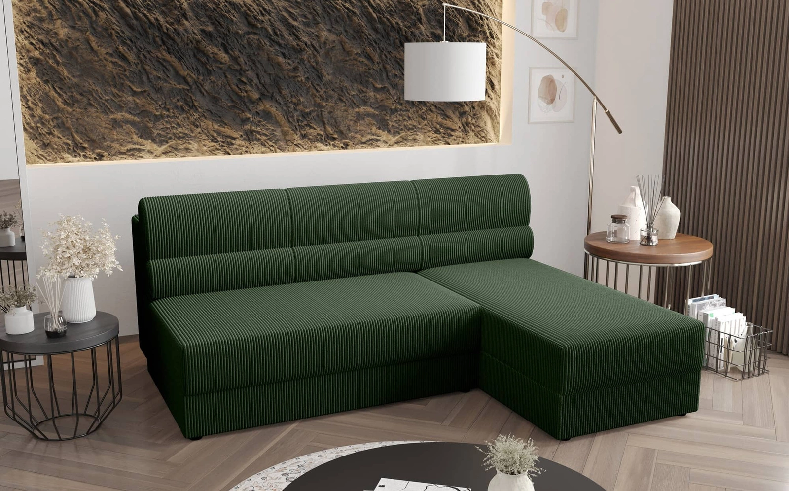 Ecksofa mit Schlaffunktion Fogu grün rechte Seite stilvolle Ecksofa mit einfachem Design mit Cord-Stoff Bettzeug Container abgedeckt