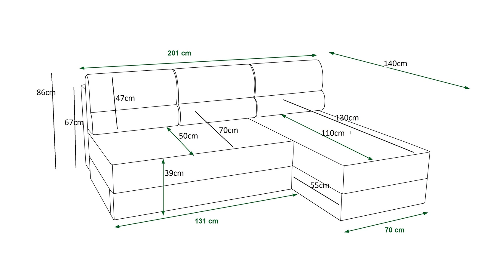 Das Ecksofa mit Schlaffunktion eignet sich dank seiner Abmessungen und seiner breiten Funktionalität ideal als Ecksofa für das Wohnzimmer oder als klappbares Ecksofa für das Gästezimmer. Ein Ecksofa mit Schlaffunktion ist auch eine gute Alternative zu einem Bett im Zimmer der jugendzimmer. Breite der Ecke 201 cm, höhe 86 cm und Tiefe 140 cm. Die Liegefläche des Eckschrankes beträgt 130x200 cm. Die Sitzhöhe des Möbels beträgt 39 cm, und die Höhe der Rückenlehne beträgt 47 cm. Polyurethan-Schaumstoff T30 ist das Material, aus dem der Sitz der Ecke hergestellt ist. Weich rückenlehnen-Kissen gewährleisten einen hohen Komfort bei der täglichen Erholung, den Sie und Ihre Gäste, die auf diesem einzigartigen Ecksofa sitzen, zu schätzen wissen werden.