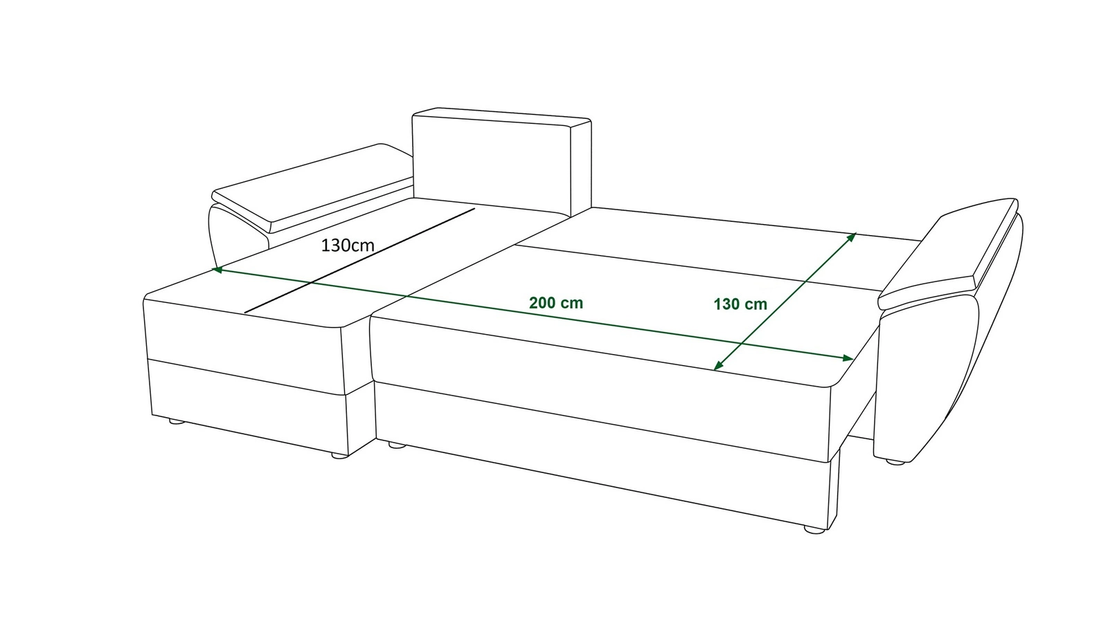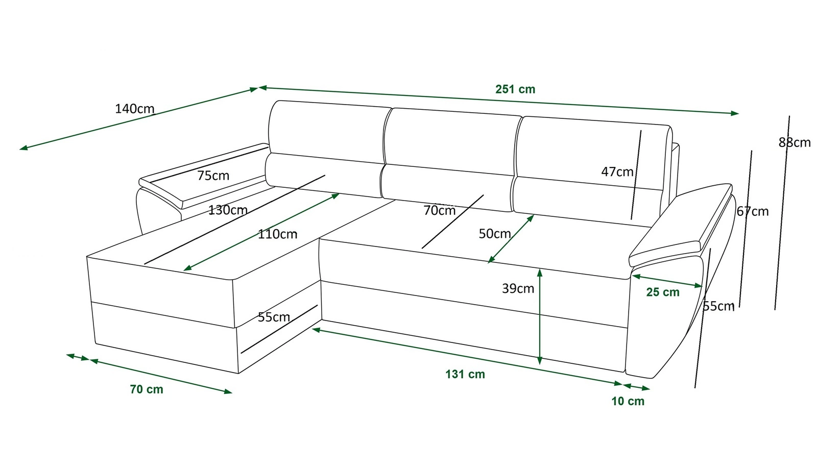 Das Ecksofa mit Schlaffunktion eignet sich dank seiner Abmessungen und seiner breiten Funktionalität ideal als Ecksofa für das Wohnzimmer oder als klappbares Ecksofa für das Gästezimmer. Ein Ecksofa mit Schlaffunktion ist auch eine gute Alternative zu einem Bett im Zimmer der jugendzimmer. Breite der Ecke 251 cm, höhe 88 cm und Tiefe 140 cm. Die Liegefläche des Eckschrankes beträgt 130x200 cm. Die Sitzhöhe des Möbels beträgt 39 cm, und die Höhe der Rückenlehne beträgt 47 cm. Polyurethan-Schaumstoff T30 ist das Material, aus dem der Sitz der Ecke hergestellt ist. Weich rückenlehnen-Kissen gewährleisten einen hohen Komfort bei der täglichen Erholung, den Sie und Ihre Gäste, die auf diesem einzigartigen Ecksofa sitzen, zu schätzen wissen werden.