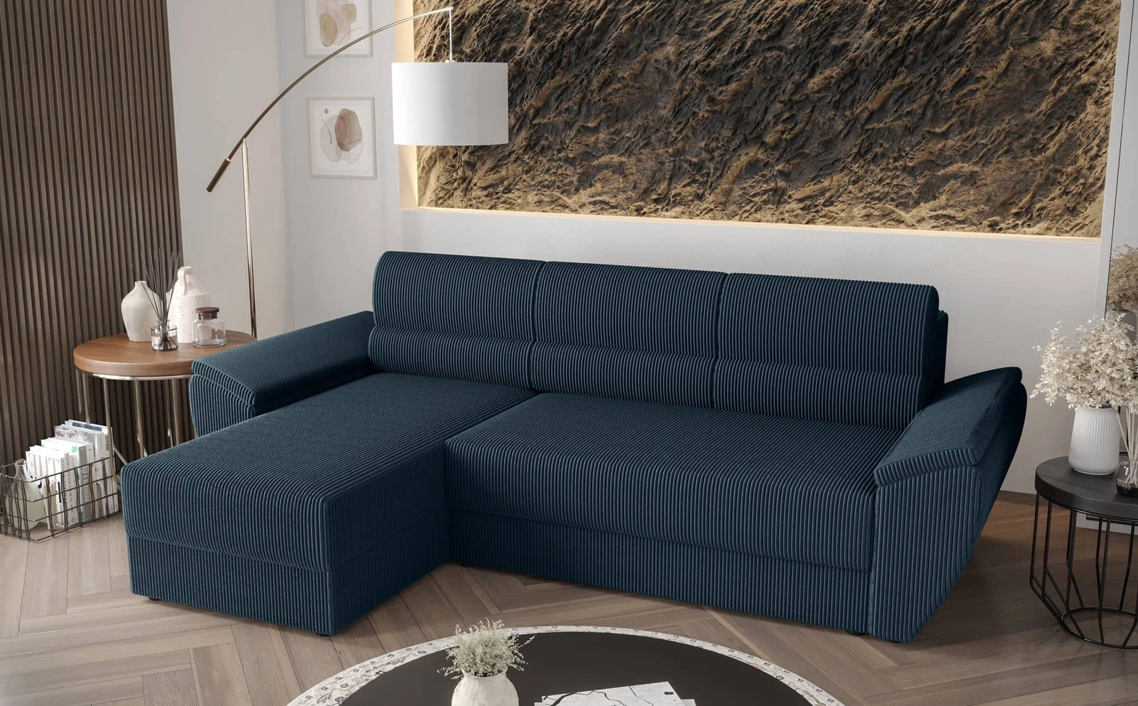 Ecksofa mit Schlaffunktion Fogu II blau linke Seite stilvolles Ecksofa mit bequemen Armlehnen und Bettzeugcontainer